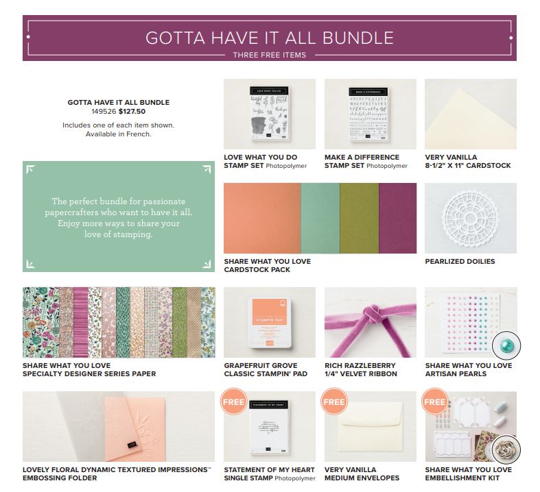 Included in your Artistry Inspired kit will be paper from the Share What You Love Specialty Designer Series set. There will be some of this for all 5 of your cards! It is part of the largest bundle that will be available on the preorder – of course if you would rather purchase it, you CAN and still participate in the Artistry Inspired class. Here is that bundle;