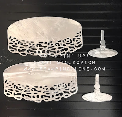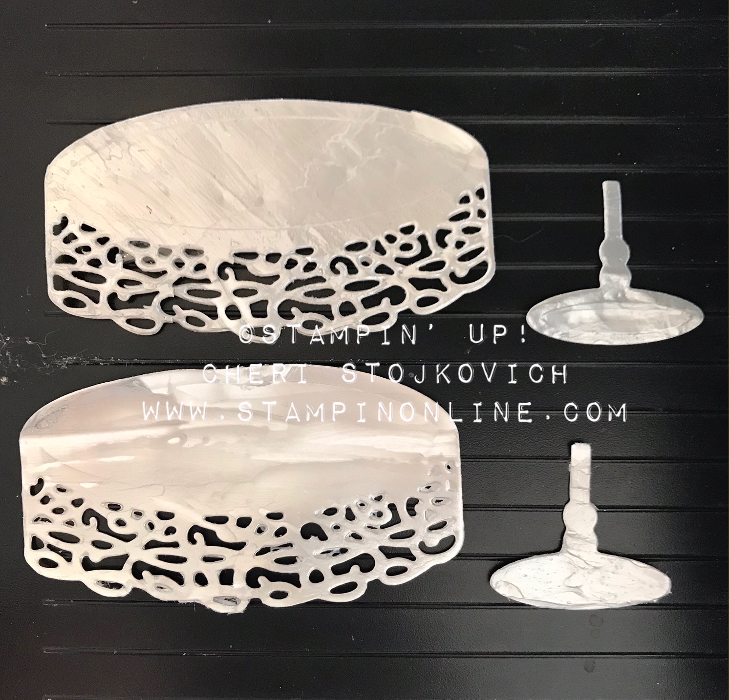 The colors of cardstock that are purchased in the class didn’t really work in creating a cake stand – which is created with this super lovely die.