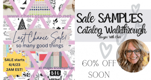 CURRENT HOST CODE IS NOW NNR9TD6J Need a copy of the NEW upcoming 2023-2024 Annual Catalog?? If you have placed an order of $50+ in merchandise from me since Nov 1, 2022 - you will be getting one sent to you automatically. If you have never received one from a Stampin Up Demonstrator before, let me know I would be happy to send you your first complimentary one at no cost. If you have not purchased for a while and need one, let me know. You can get one for $5 (I can invoice … [Read more...] about LAST CHANCE SALE! Samples of 60% of Items & More ~ Stampin Up Cards!
