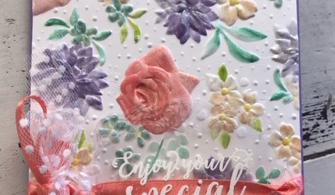 There is SO much going on in today's card. It is so pretty in person. I really needed a sunny day to capture all the different textures and shimmers..... (How many days until spring?) But, with the absence of the sun, I took several angles with the help of my studio lights to try to give you a look at how it really sparkles. I will try to remember on a sunny day to pull it out and photograph it again. First I started with Shimmer Cardstock and Window Sheet. Not your normal … [Read more...] about So Much Texture And Shimmer With This Country Floral Wedding Card!
