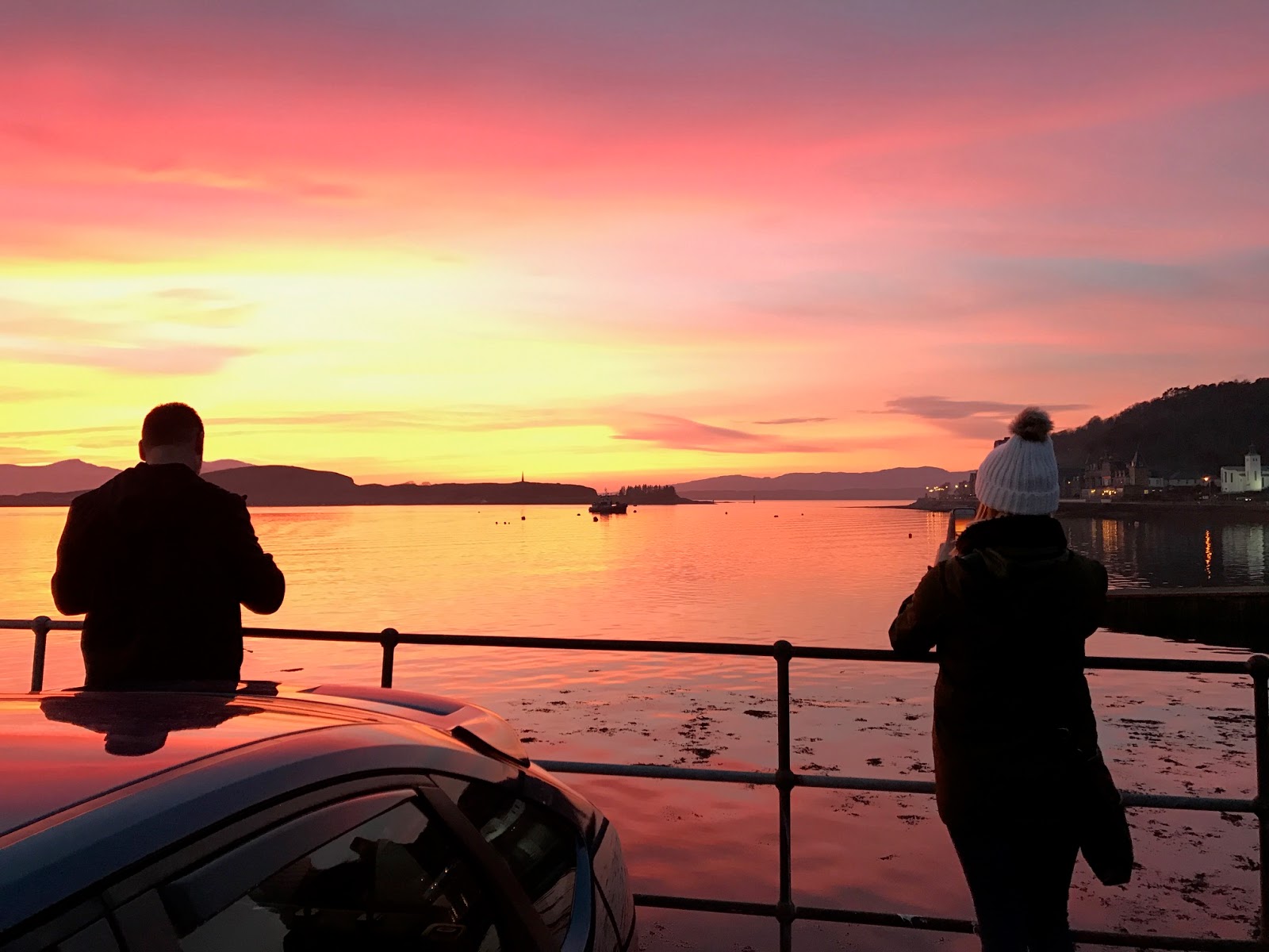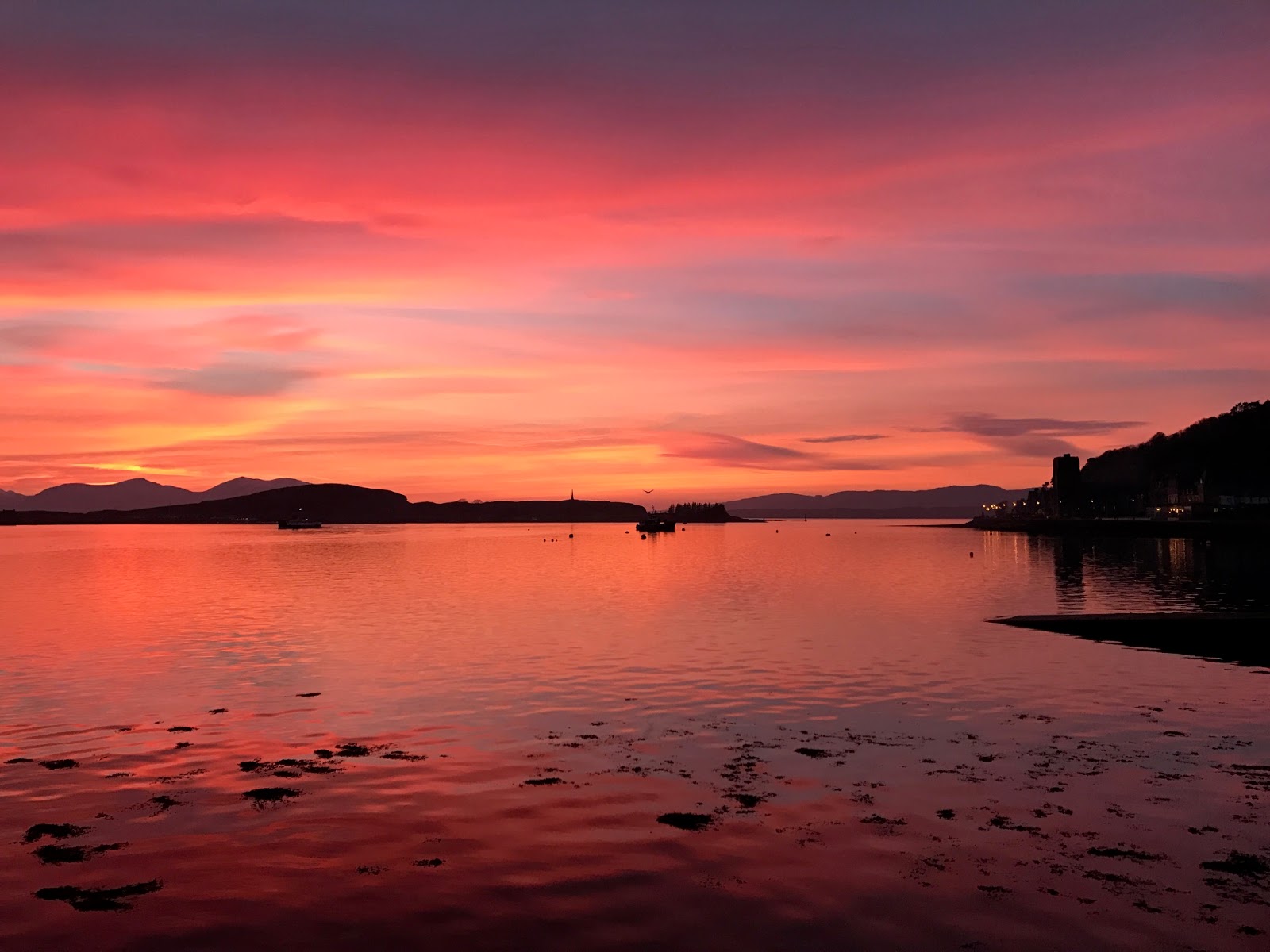It turns out that the town where the hotel was was very tiny and had mostly places to stay for those hiking in the Glen Coe area. But when we make plans when we travel we keep a list of things that we can maybe fit in if weather or other plans change. Oban is a sea town that we had taken out, but by the time we got to Glen Coe (in true Scottish fashion) the weather had cleared. So we decided to drive to the coast for dinner and stop at some sights along the way.
