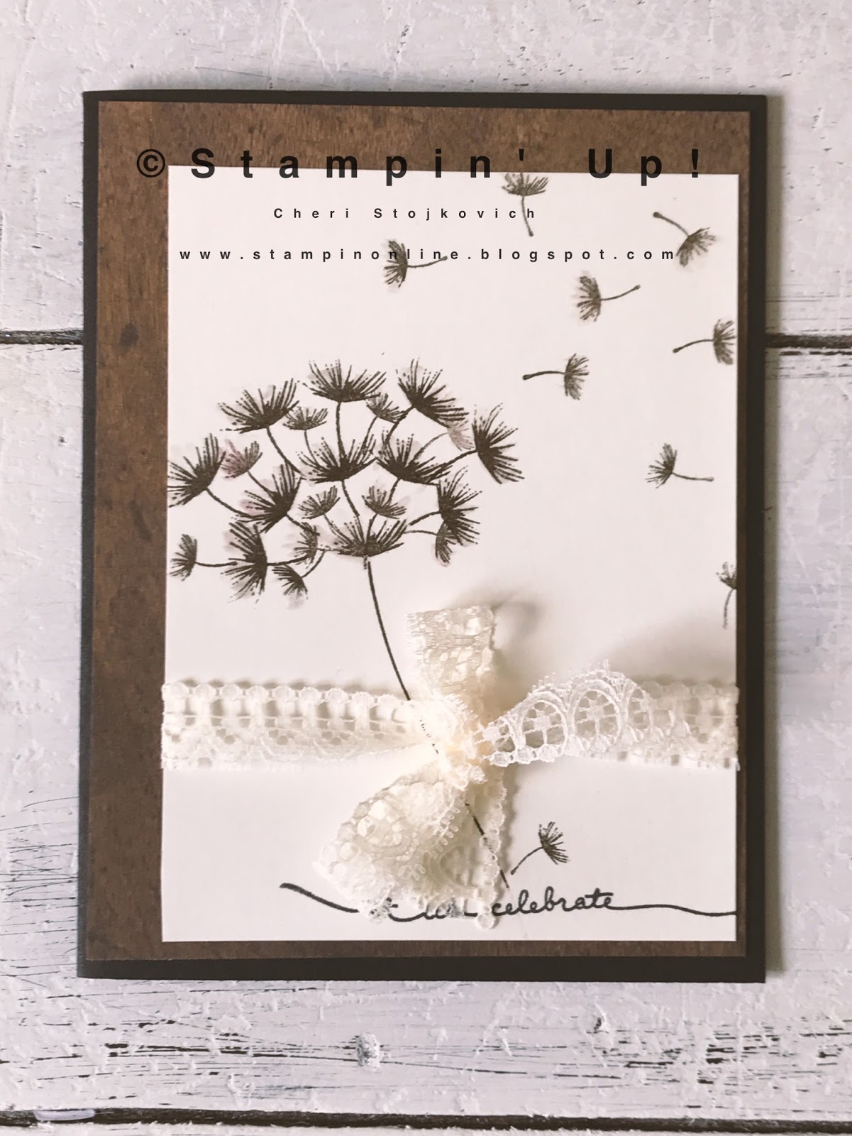 The stamp set also includes two little ‘whisps’ – just stamp them in the arrangement of the blowing dandelion and you are done! I went with a country farmhouse look. I pulled out our lace ribbon and the super fun wood look Designer Series Paper.