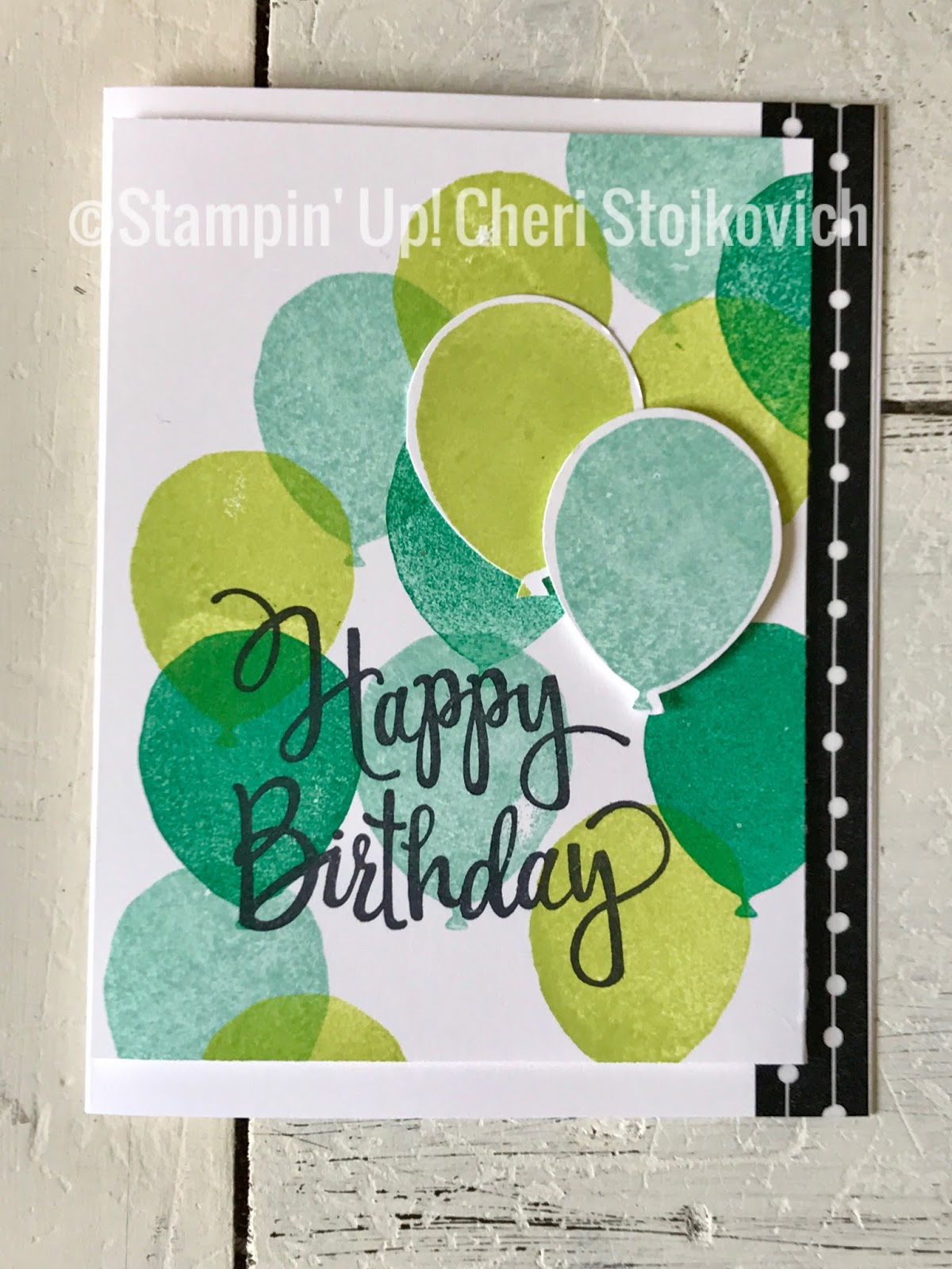 Some simple changes step this card up just a notch! The stamp set has a fun double balloon punch. I stamped two balloons on a small scrap piece and punch them to give the card some extra dimension. I wanted a layered look, but sometimes you might not have cardstock in the color that you would like. One of my favorite go-to’s is black. You can see along the edge I added one strip of black washi tape! Washi tape is inexpensive, so you can have all of the coordinating colors in that as you build up a cardstock collection!