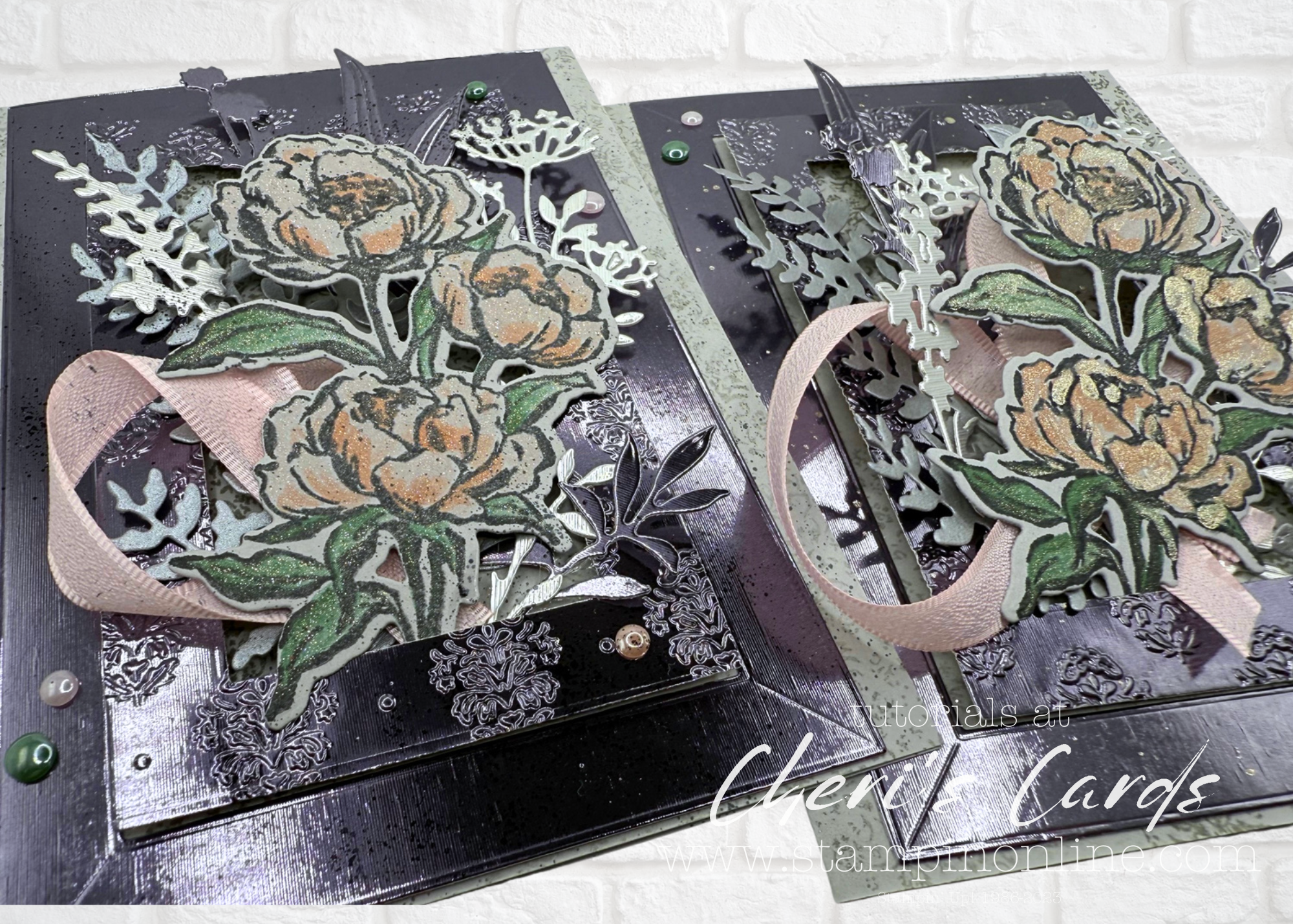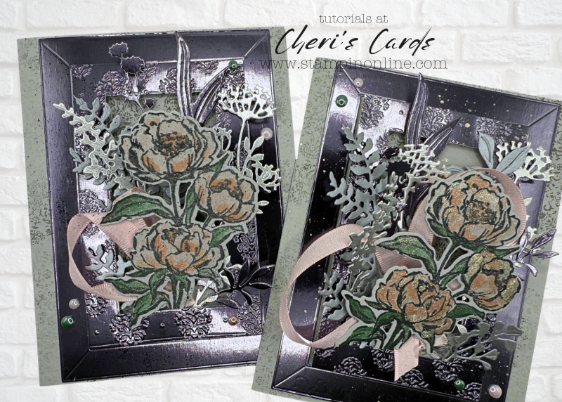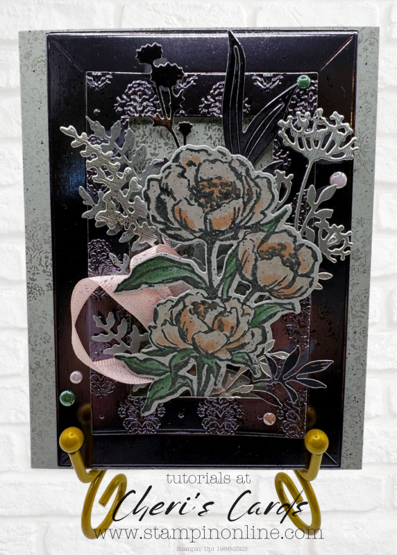 This card features warm silver tones with the fun 3D bouquet. There is a mix of the retiring Textured Metallic and the new Lustre.