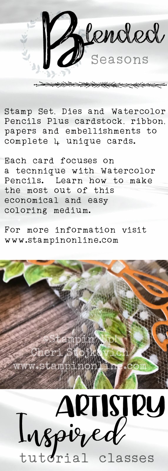 By the end of this week I will have all of the information ready for you to be ready to purchase the August Artistry Inspired Blended Seasons Class! The class will include the Blended Seasons bundle (stamps and dies) and the new Watercolor pencils. With that purchase you will get the consumable supplies to complete 4 adorable projects! You will need a few additional supplies to be able to make the items – all of those items will be included when I have the class details posted. If you don’t have them, you can add them when you purchase your bundle.
