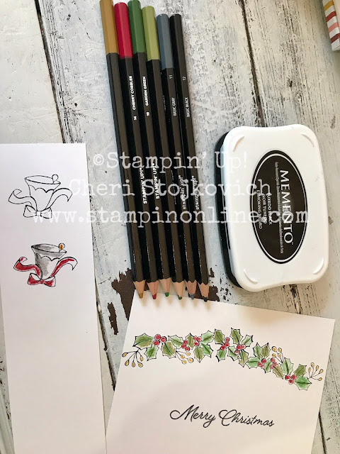 Note -that to complete THIS project: you would need a Memento Black Pad, Wink of Stella, the original Watercolor Pencils, Blocks (if you choose clear mount), Big Shot, Gold Gimmer Paper, Shimmer Cardstock and Cherry Cobbler Cardstock. Adhesive, Dimensionals.