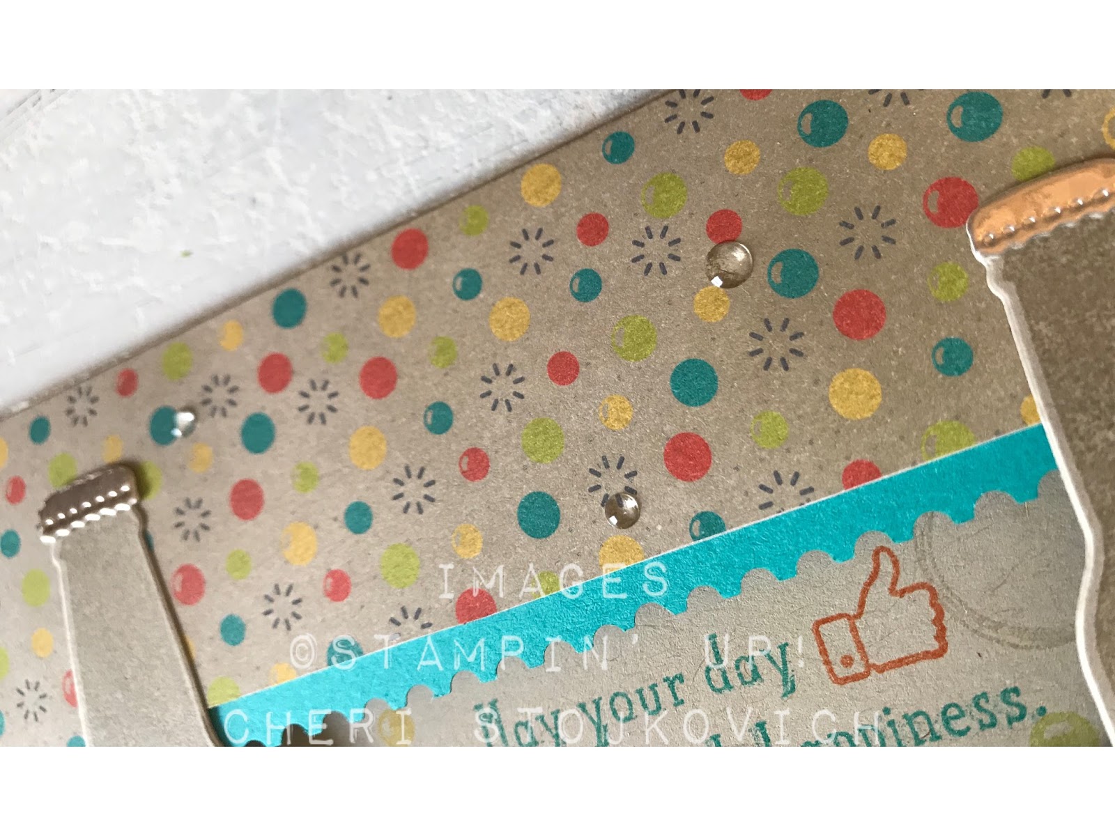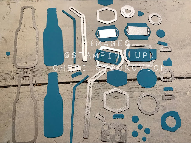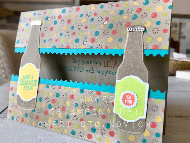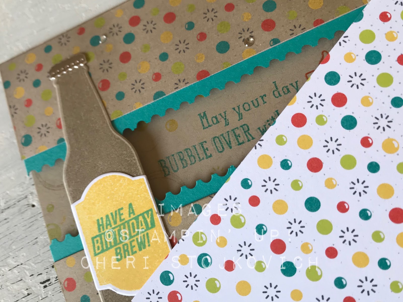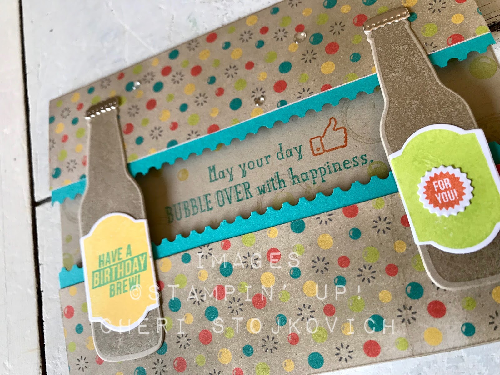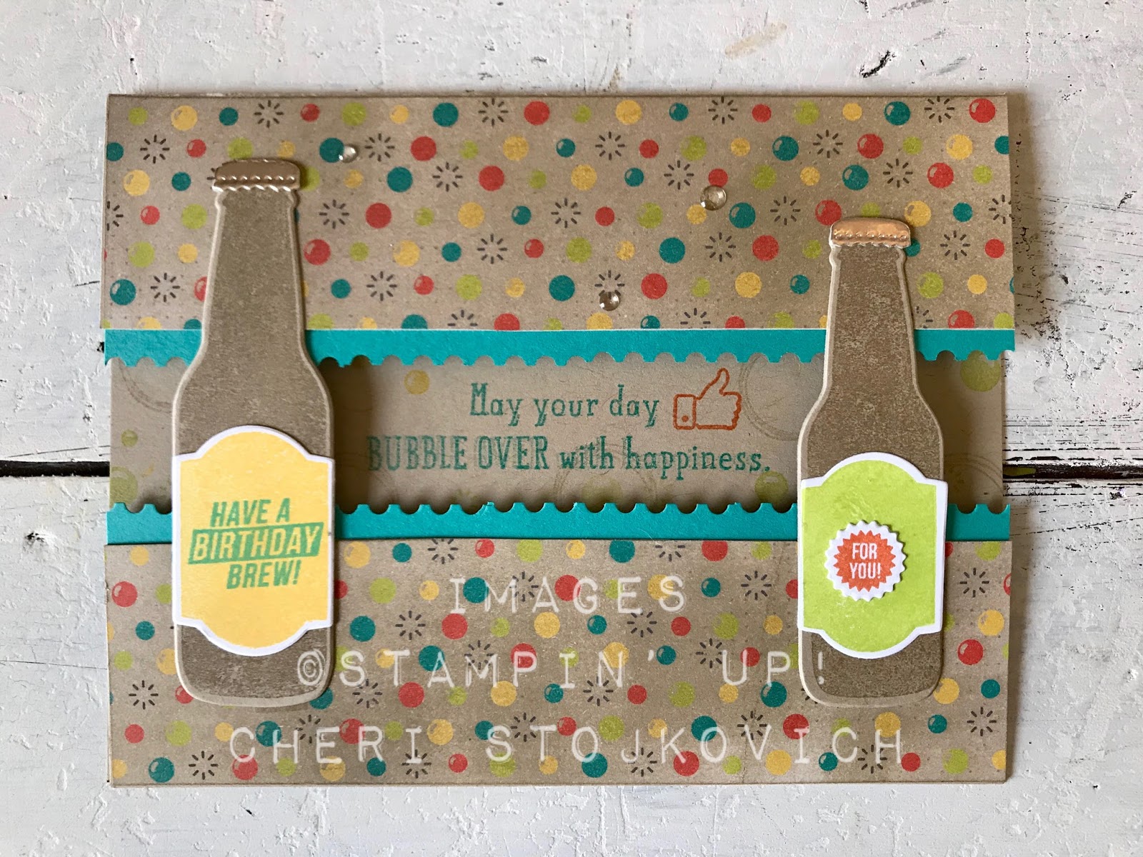 The card has a masculine feel to it. It is from a fun, lighthearted soda set – the stamp set is called Bubble Over. It has bottles, labels, straws, bubbles, hearts, backgrounds and more. So fun. It can be sodas or even craft beer.