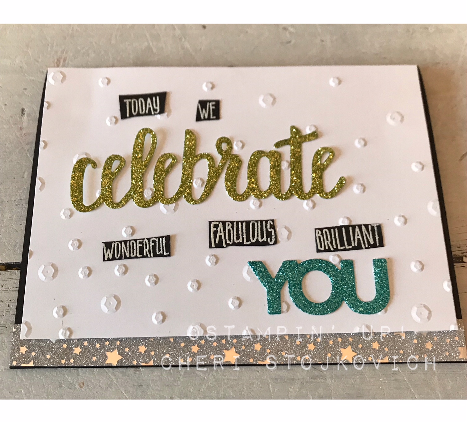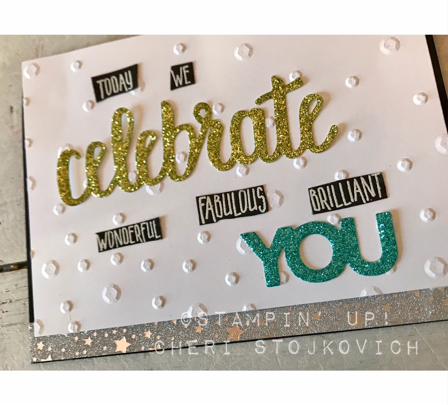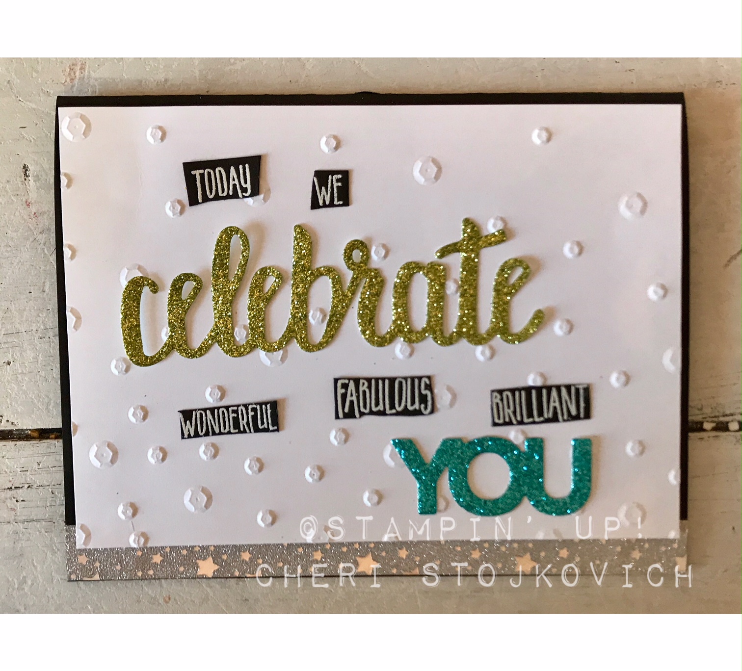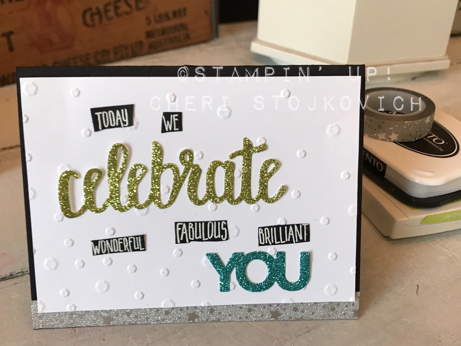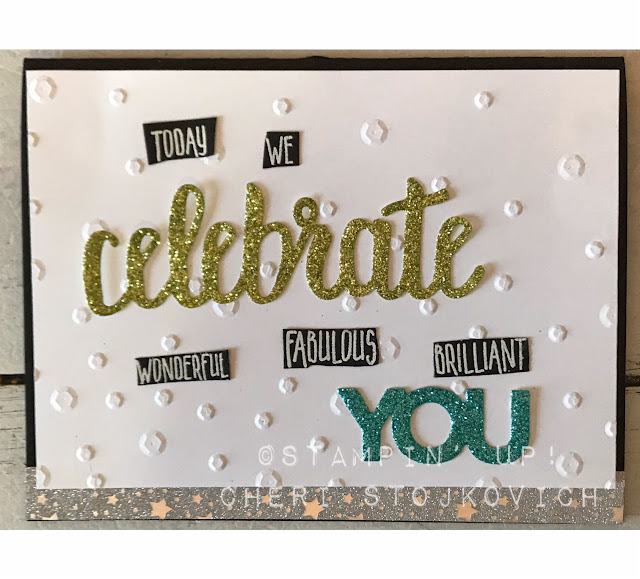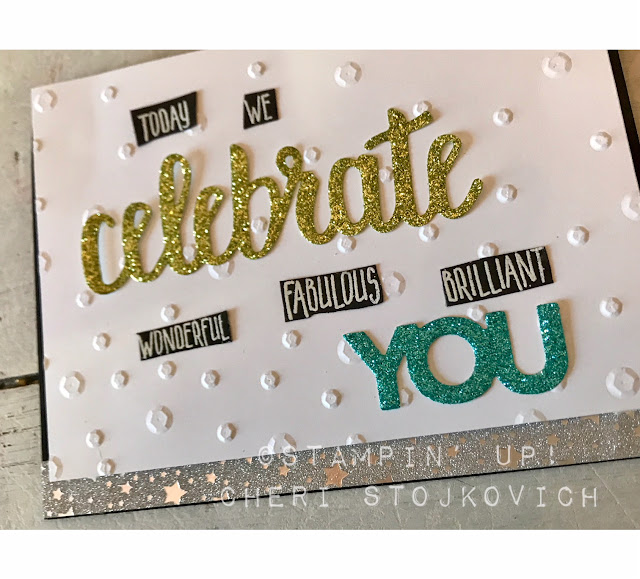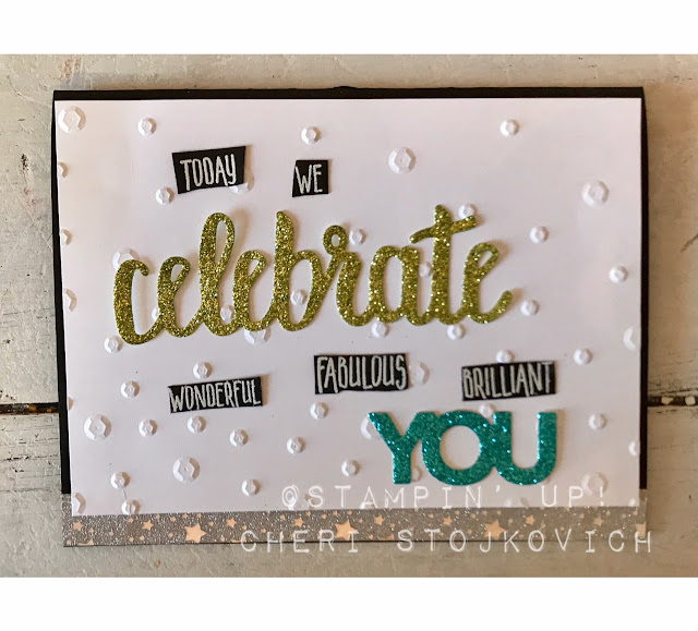 The thinlits are a FREE Sale-A-Bration selection this year!! Love them! They add so much to your card. The words are commonly used in our sayings, so it gave me the idea to simply replace the small words with the LARGE die cut glittery word – I think it worked well! The sequin folder is new too – and such fun!!