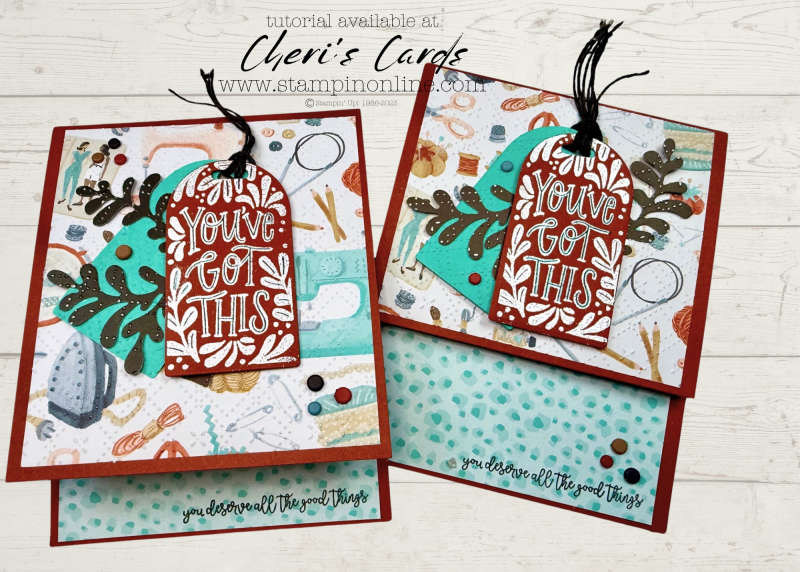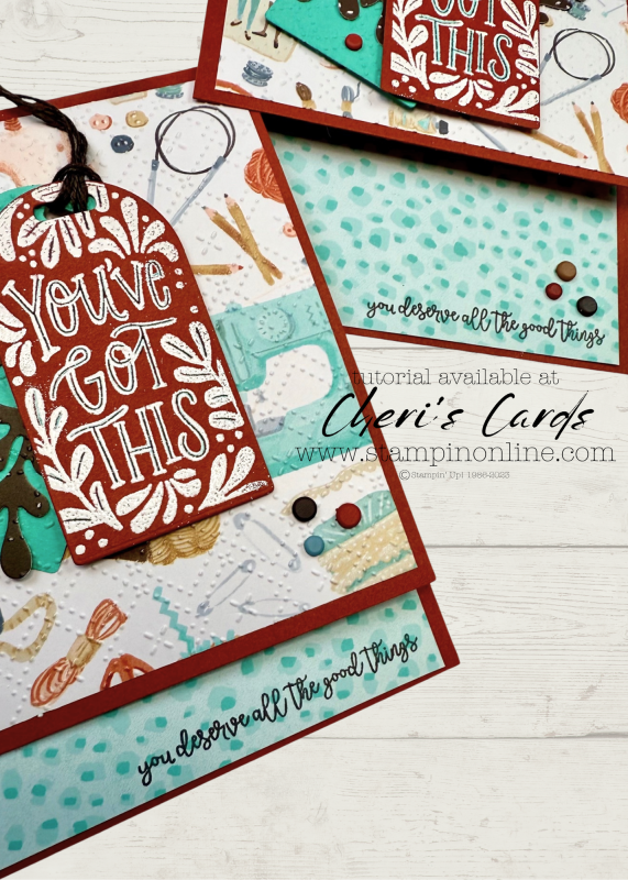 For this card I chose the ‘all things fabric’ paper (sewing, needlepoint, crochet, etc) – but you can take the same design and change it to any of the other themed papers to match what goes best with the one you are making the card for.