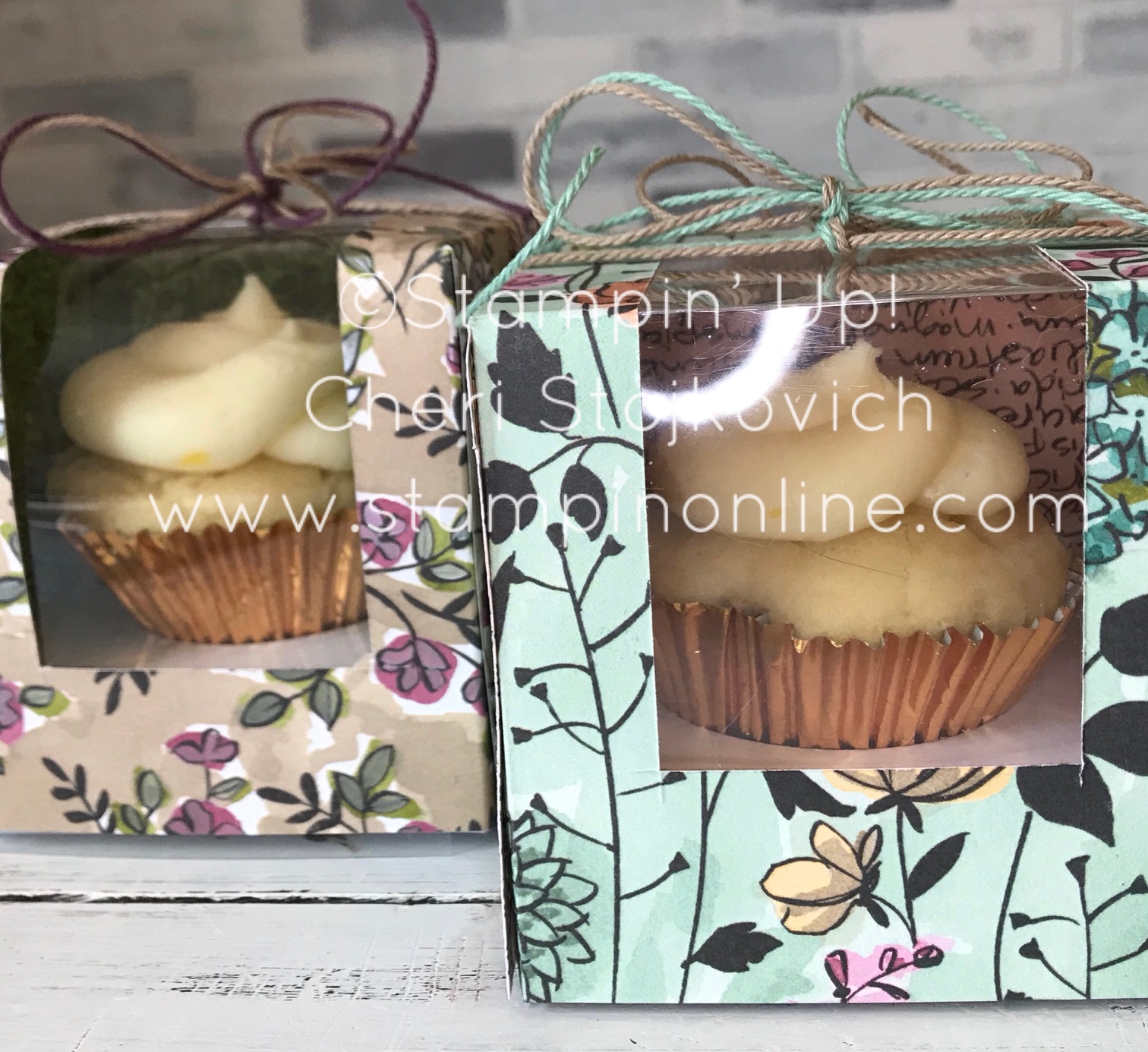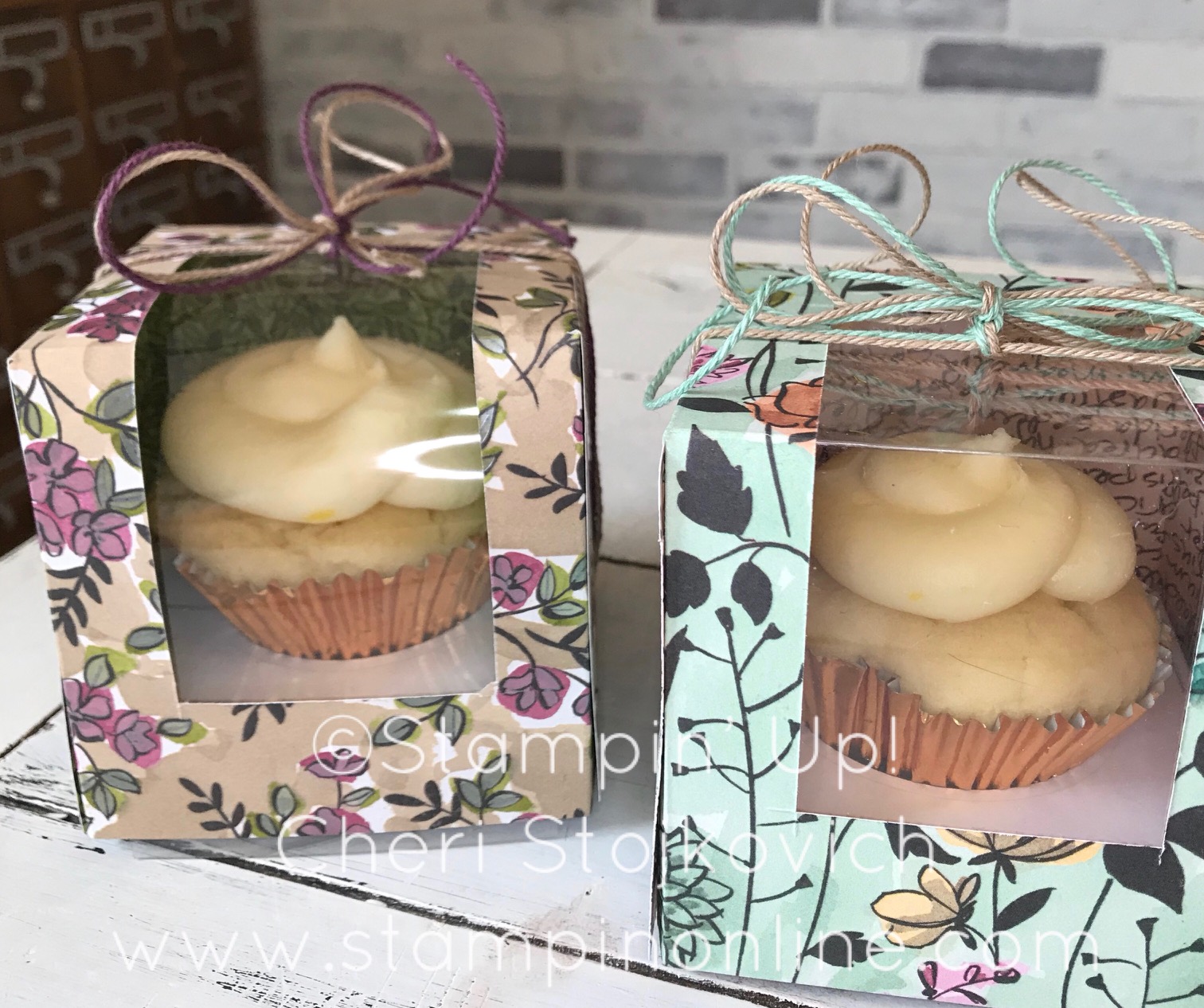 After I filmed I realized that the scoring bits are out of the camera range – sorry about that – but we will be making the box again! I was going to skip a month – BUT (here is some scoop for you….. designer series paper is on SALE in July) so we will be making them again. I will film again – but this time it might not be cupcakes in the boxes~