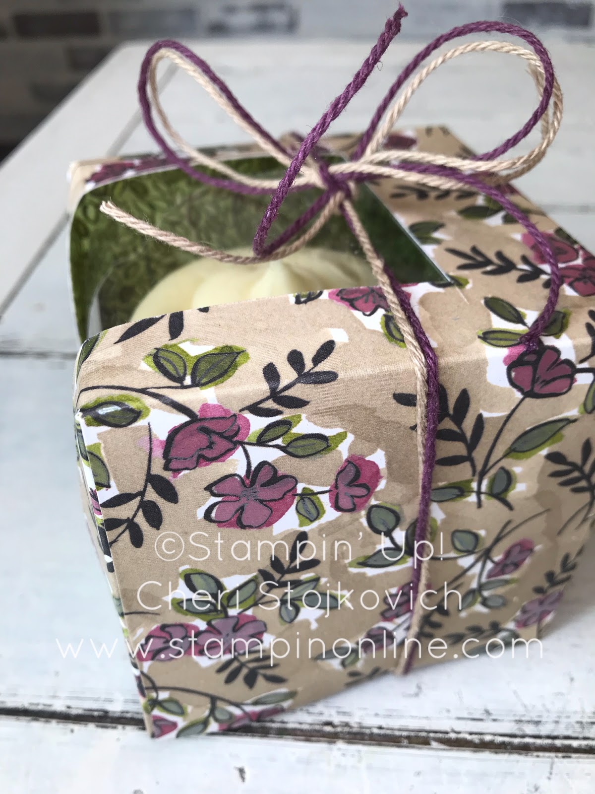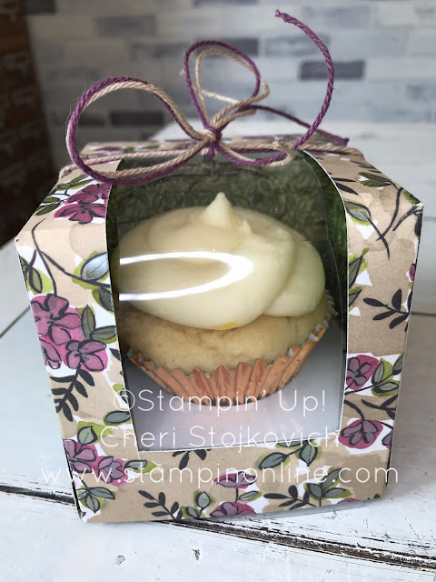 It is also one of the fun times that you get to see BOTH sides of the Designer Series Papers! In May we used the cut our portion of the window to make gift tags to attach. This month we had lots to do on our other projects, so just tying the twine around gives it a nice ‘bakery’ feel.