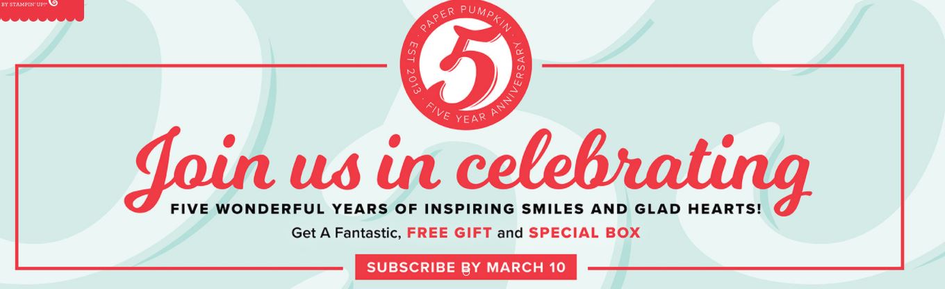 This March – Paper Pumpkin turns FIVE. All subscribers will get an additional free gift in their box. Don’t Miss Out! To get the March kit, you must have your subscription reserved by no later than March 10.