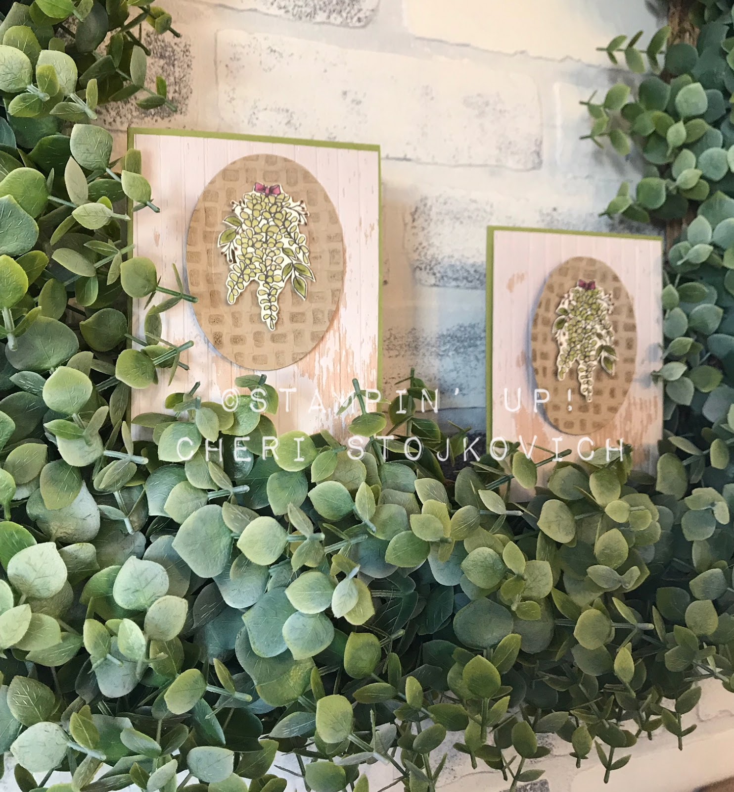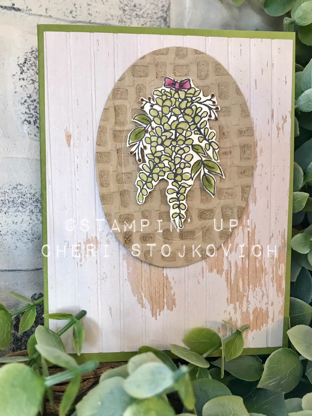 I wanted to fill it with some Eucalyptus. We don’t have a stamp that works right now – so I simply flipped the Sale-A-Bration Lavender upside down, colored it with the Blends – and “She’ll Be Right” I had what typically sells for Eucalyptus everywhere around here and even longer leaves that had the bigger gum nuts that I could go out the back and just whack off to bring inside when we lived in Australia.