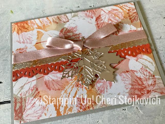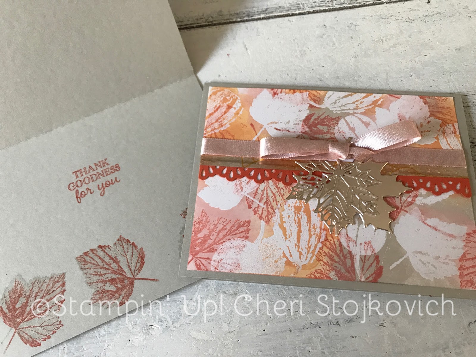 This card ended up NO WHERE close to where it started. I took some pictures of the process and will do a post on that someday soon. There are two pumpkins in the stamp set. The card was vanilla and sand. No leaves, no color. Then it morphed to include color. When I went to add ribbon I really wanted to use this lush Powder Pink….so I redid the card (about the 6th time) taking all the colors down one to include the pink as the lightest. Sometimes magic happens. Sometimes it’s just a lot of work, lol.