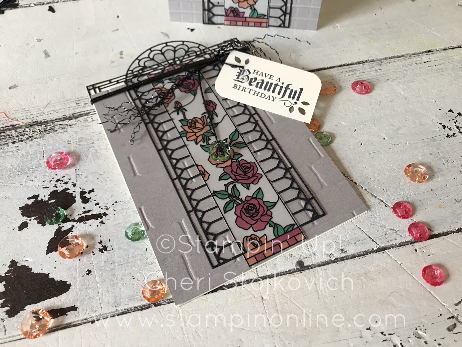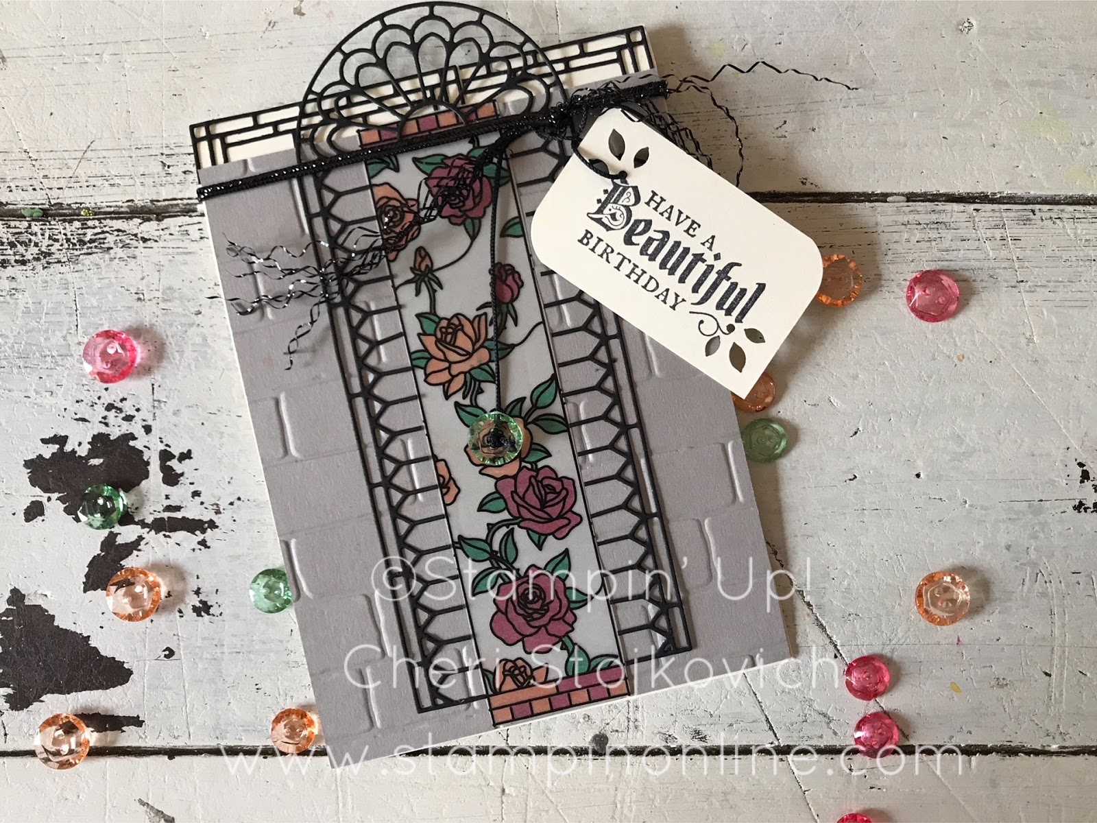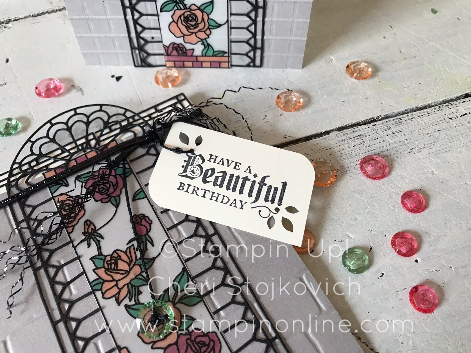 This is another Sneak Peek bundle from the upcoming June release of the Stampin’ Up! 2018-2019 Catalog! Reminds me a little of Beauty and the Beast… a little of the cathedrals in Italy, Slovenia and Scotland that we have visited on recent trips – and even of my very first days of stamping – when coloring on the back of vellum was ALL the rage!