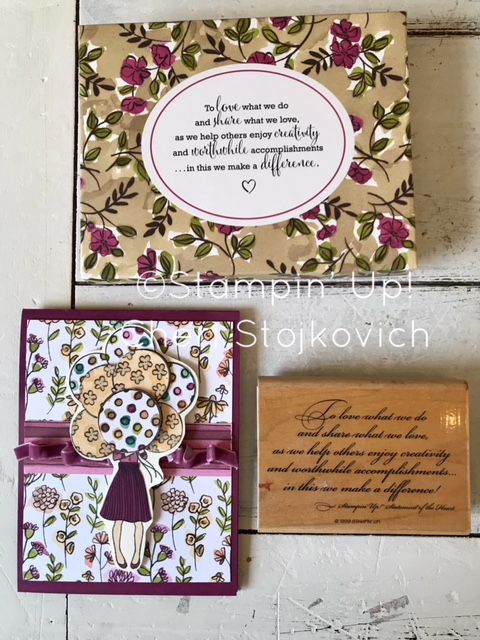 Also included in the bundle for the Artistry Inspired class are not only the free supplies from ME – but also some freebies from Stampin’ Up! There is a fun little embellishment kit that comes in an adorable box. On the top is the Statement of the Heart. I have an original Statement of the Heart stamp as well…..from 1999!