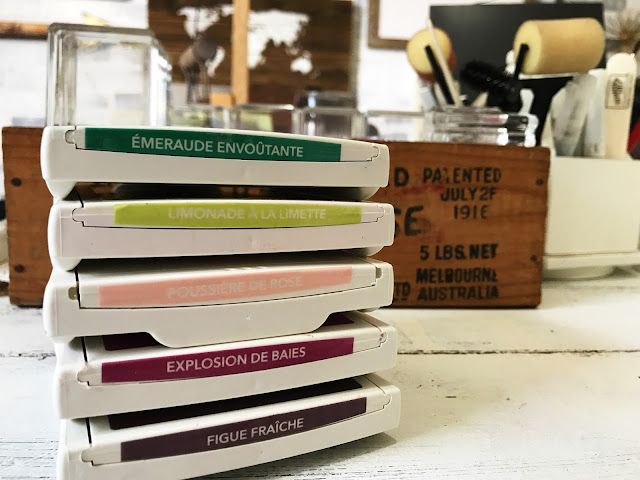 Here are the colors I used on this week’s 3 minute video card. When I attach the stickers to my new stamp pads of course I put the English sticker on one end. Then – I choose one of the other language stickers to add to the other. Two reasons for this: If the pads are facing the opposite way then I can still see what color it is. AND – it’s just fun! The names (especially in French!) are just fun. Say them out loud while you stamp and it will bring a smile to your face. I promise.