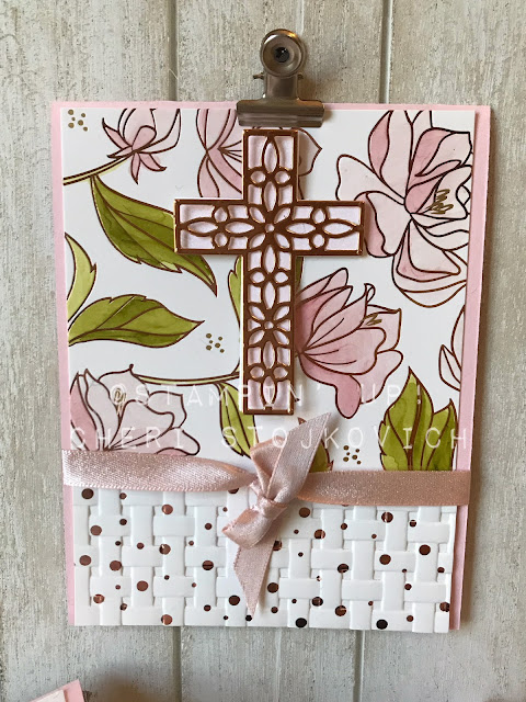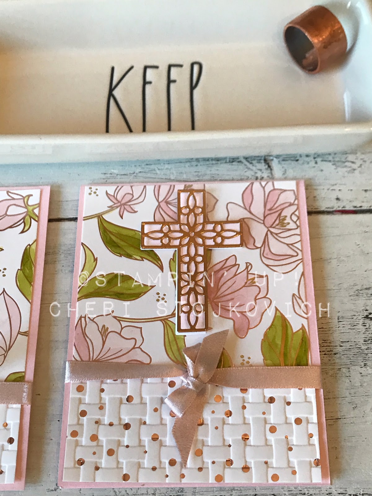 To ease in layering, I did use an adhesive sheet on the oh, so pretty copper cross that I die cut. It makes layering over the pink stamped one a quick and easy thing to do – with no adhesive poking through to interfere with the beautiful design.