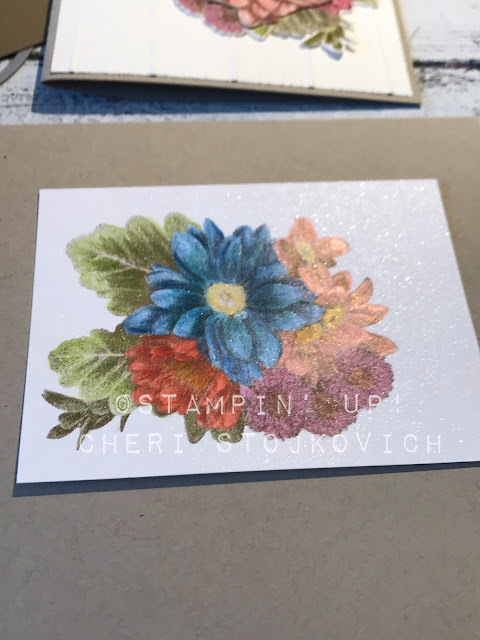 A tip for when you color in images like these – flip your stamp over and use the sticker for a guide. It is sometimes easier to see “where you are going” Also to avoid the pencil line look – don’t color on a hard surface. I laid my shimmer cardstock on the stack of crumb cake to soften the underneath. Press lightly – color all over first and then go back with a second coloring over the shaded images where the stamp is!