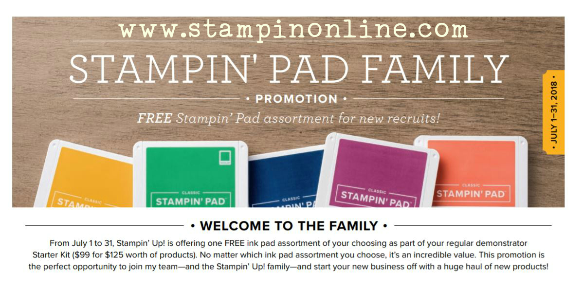Coming this July – join my Stampin’ Up! team and in addition to the fabulous starter kit – pick any one of the the five wonderful new color family ink pad stacks COMPLETELY FREE!
