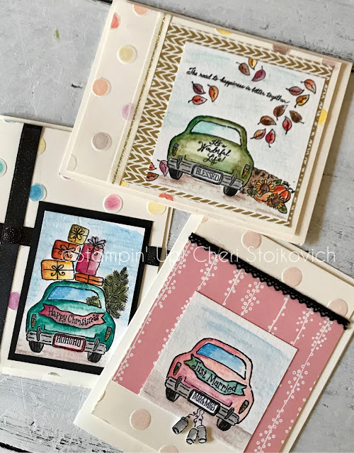 The set is designed with the old car as the focal point and then it comes with 18 other pieces to design to make the scenes to surround it. Super easy – since it is photopolymer. Lining it up isn’t an issue at all. You might want to use your foam pad underneath – which will always ensure your photopolymer works well everytime you stamp with it.