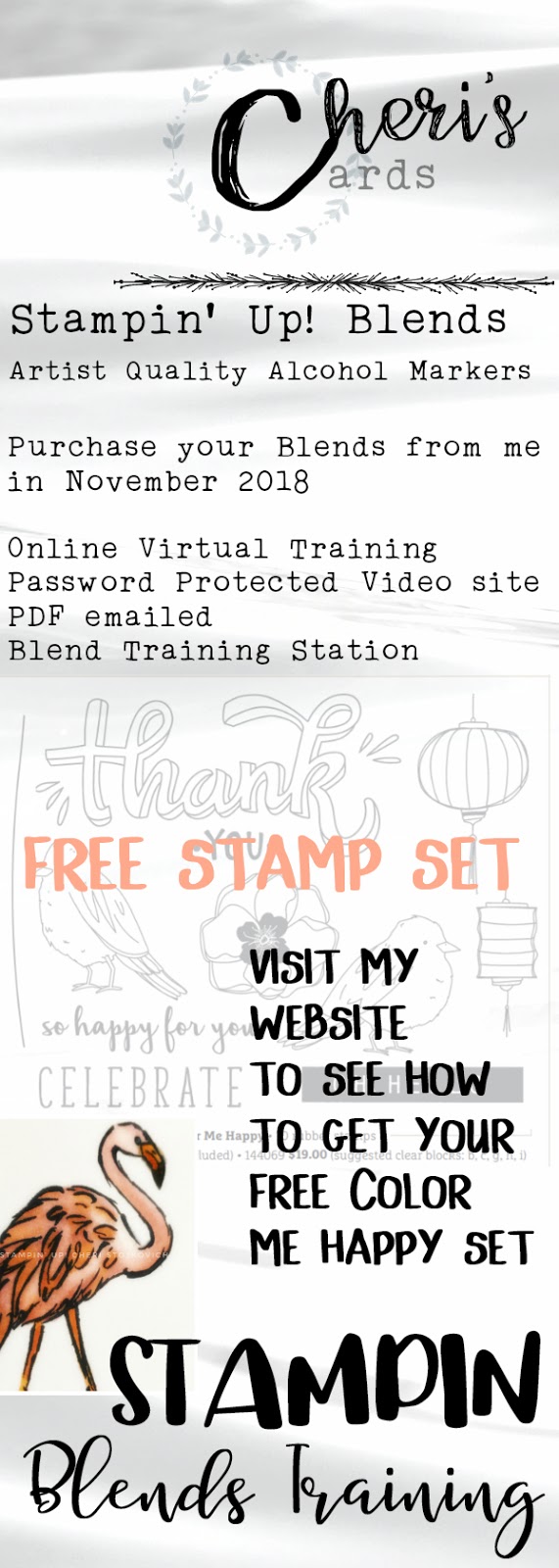 If you purchase the full set of Blends + the Color Me Happy PROJECT KIT from me in November you will also get a FREE Color Me Happy STAMP SET!! This set is designed specifically to be used with the Blends and will give you a great style to practice your new artistic skills out on during our training time!