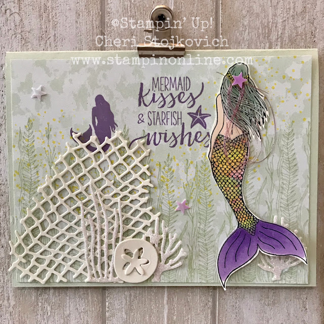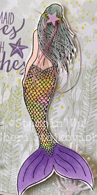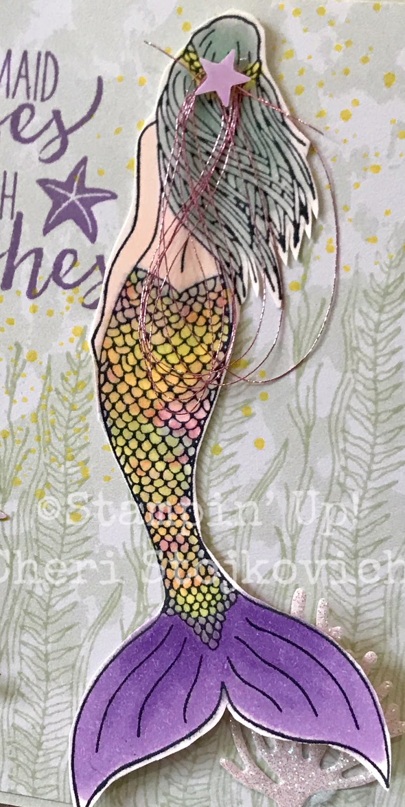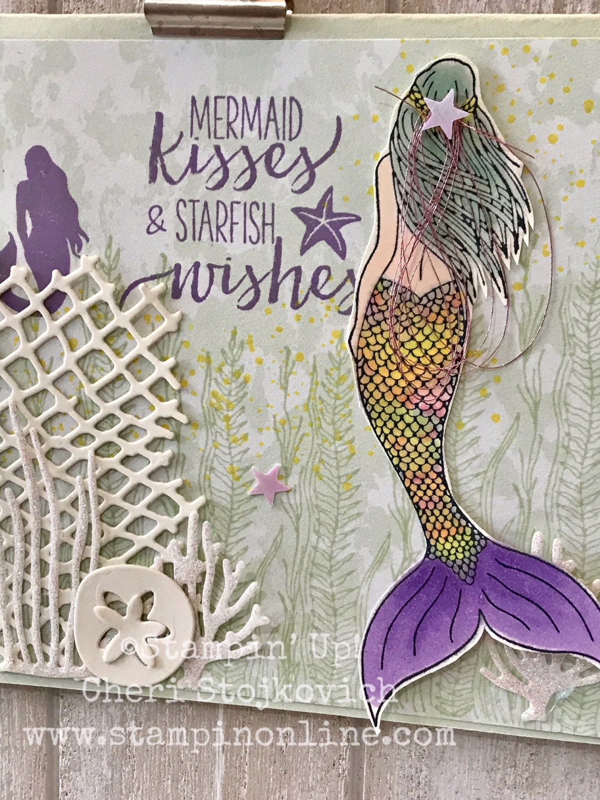The reasons I LOVE today’s card? Well, they are many. 1) The mermaid makes me miss my niece working her little ocean job on the East Coast. So each time I color a little fin – I think of Kasey doing her thing under the sea! 2) The Blends. Grown Up coloring. It is just good for the soul, right? And of all the ways to color – using the Stampin’ Up! Blends – it’s my favorite. 3) I love using the DSP with stamp sets that it isn’t meant to go with. So many stampers just use the paper with the suites that it goes with. Step out of your box peeps! It will be ok! Although, this is the Tranquil Texture paper – so it isn’t a stretch. 4). Our little mergirl doesn’t have any dies of her own – but she works SO well with the Under the Sea die – a match made….under the sea!