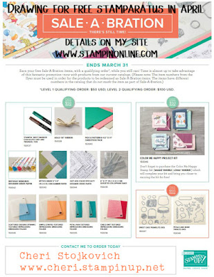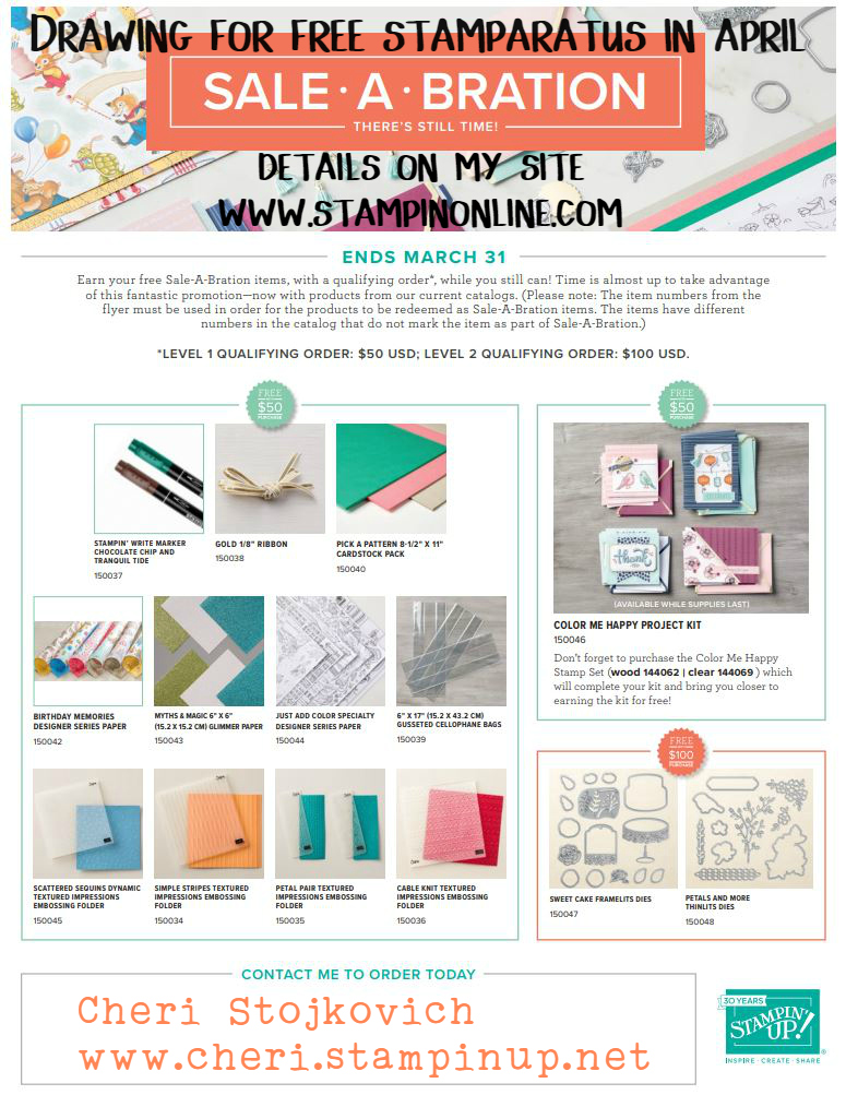This card also features the Simple Stripes embossing Folder – which GUESS what…is also a SAB choice til the end of March! Here are the items that started today in addition the Sale-a-bration items that were already ongoing. You can click here to go to my website to see the items up close. I will give you a little **hint** if you are on my email list – you will be getting a $17 free gift from me on the 16th of March, good for just 24 hours!