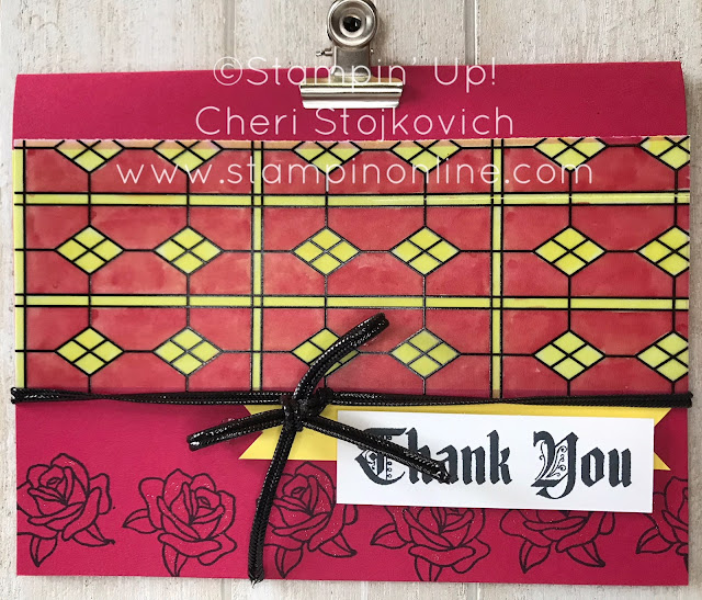 The next card uses the Graceful Glass suite. A little bit “Beauty and the Beast” mixed with a little bit of all the cathedrals we have seen recently on our trips to Europe….wait, maybe Disney was inspired by those European castles, lol. The set even has a rose all set to lose it’s petals. The highlight of this suite is the fabulous pack of designer vellum that can be colored for a wonderful stained glass effect.