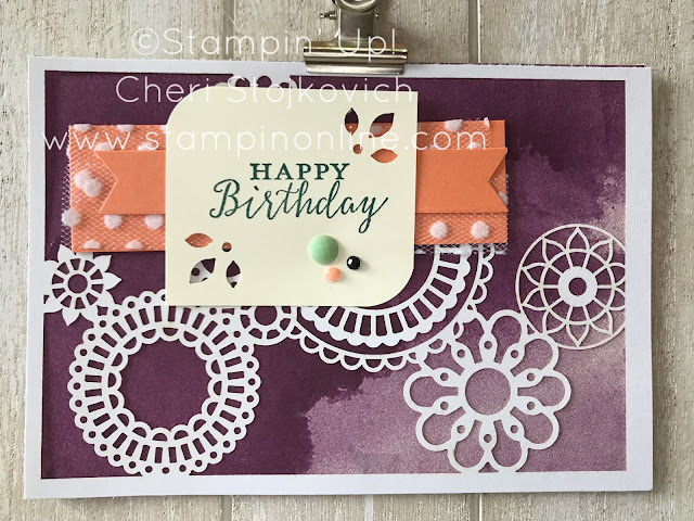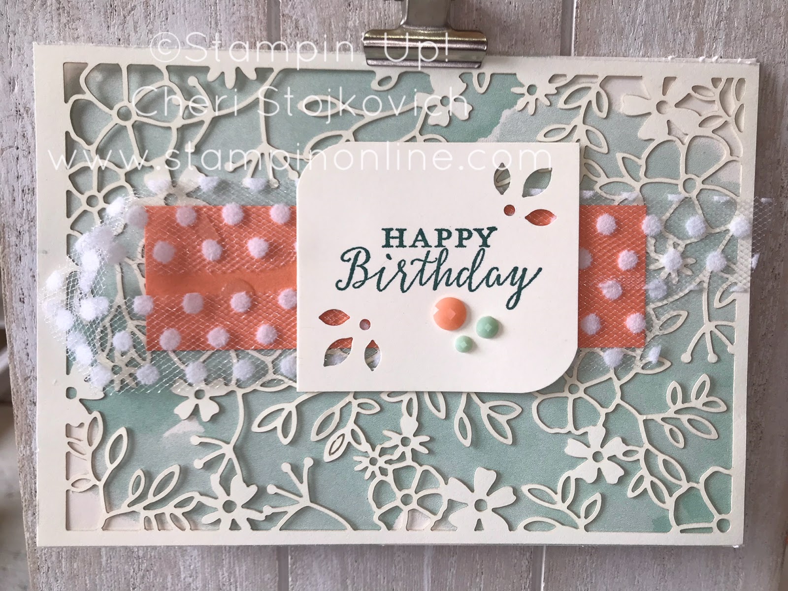 As I prepare for my team stamp day that is rapidly approaching later this month and get their projects ready for them – I will be using many of the things we did in Atlanta – but switched up in whole new ways! None of these are my designs….although I did take liberties on a few of them – and they are not quite like the sample provided, lol. These first two cards feature the Delightfully Detailed Suite. The overlay that you see is laser cut PAPER. So pretty and so easy!