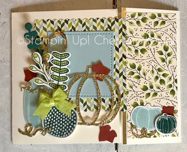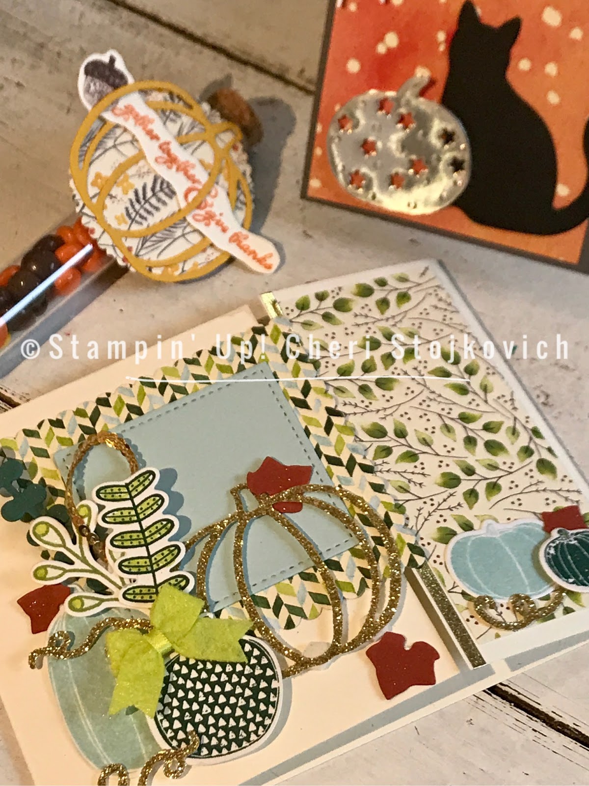 Today’s Freebie: Purchase the Pick a Pumpkin Bundle via my website using hostess code 2MVRWQRT and I will mail you the cardstock, embellishments, and designer series paper for you to make this card at home once your stamps and dies arrive.