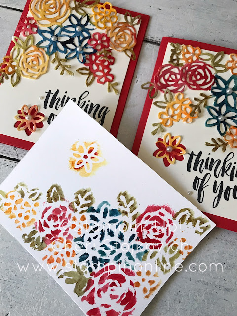 A few weeks ago I posted the card and video above – when I made the card – I used brusho to color the die cut flowers – that resulted in a beautiful ‘scrap’ (well – an intended scrap – I used Shimmery White Cardstock!) I promised you the second card in the series…..but there have been so many new things sitting on my table that it has taken me a bit to get around to posting the video – so HERE is the second card in the series!