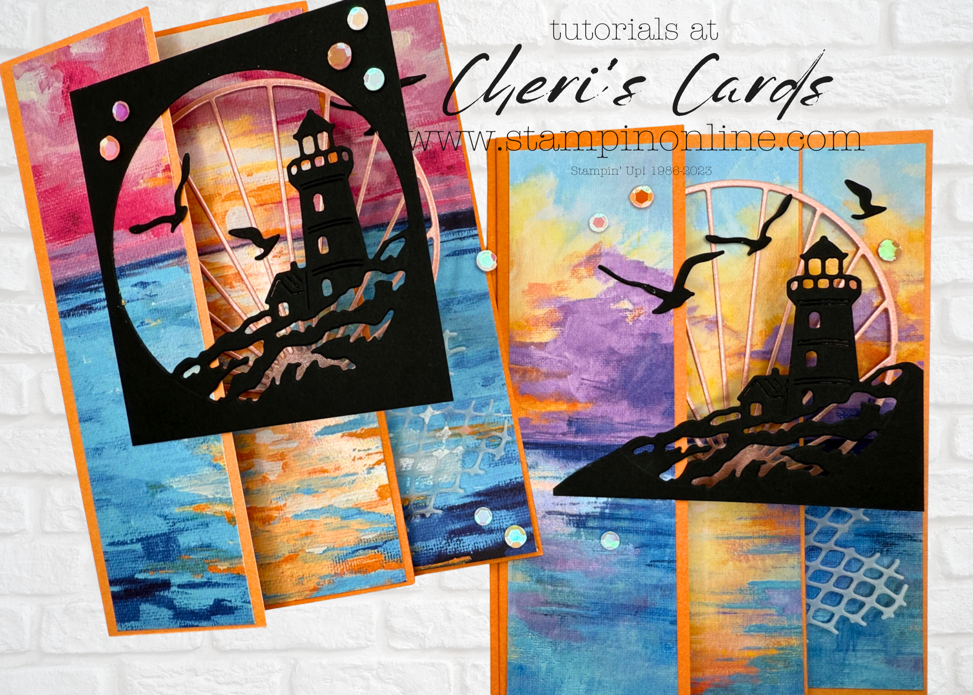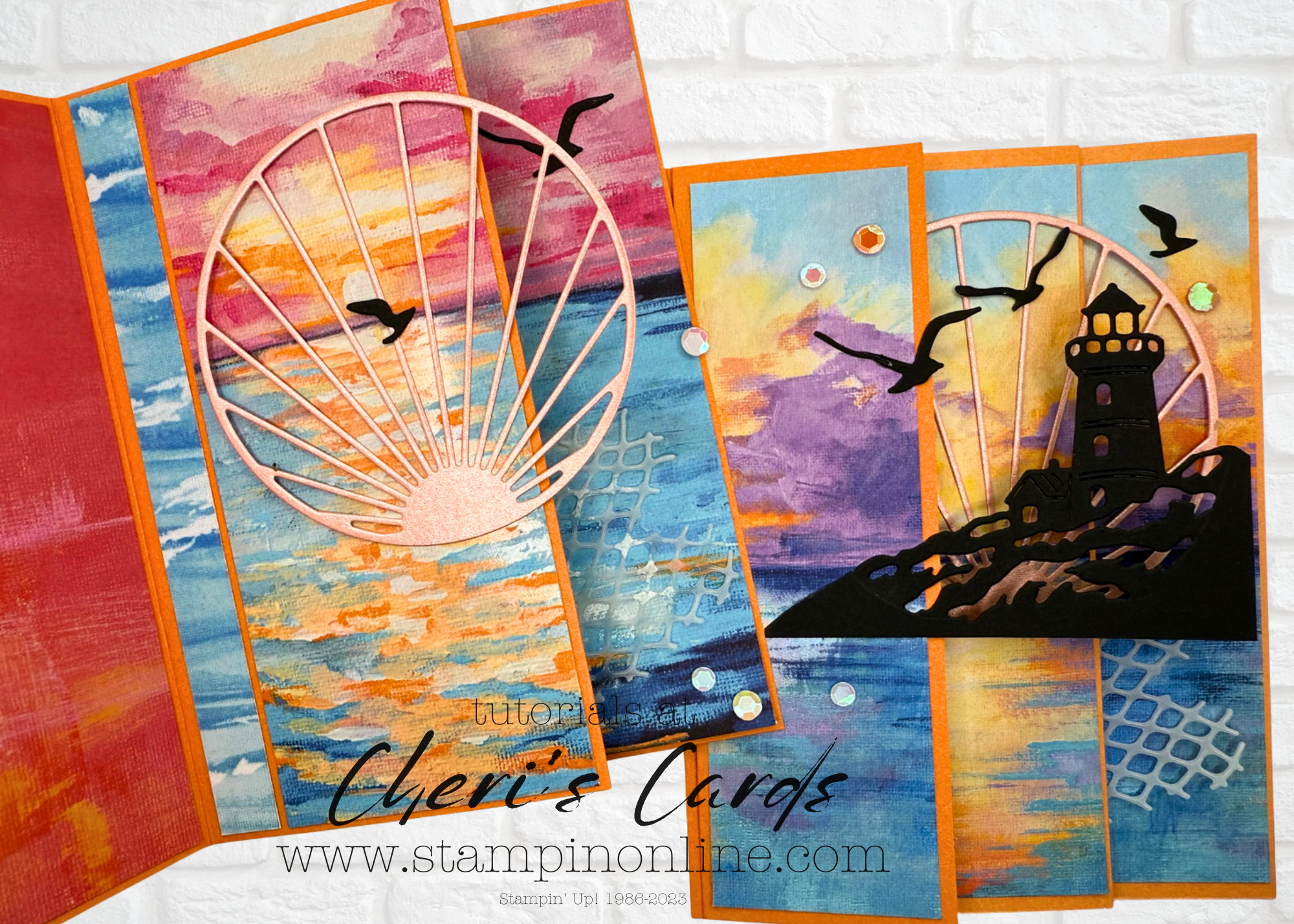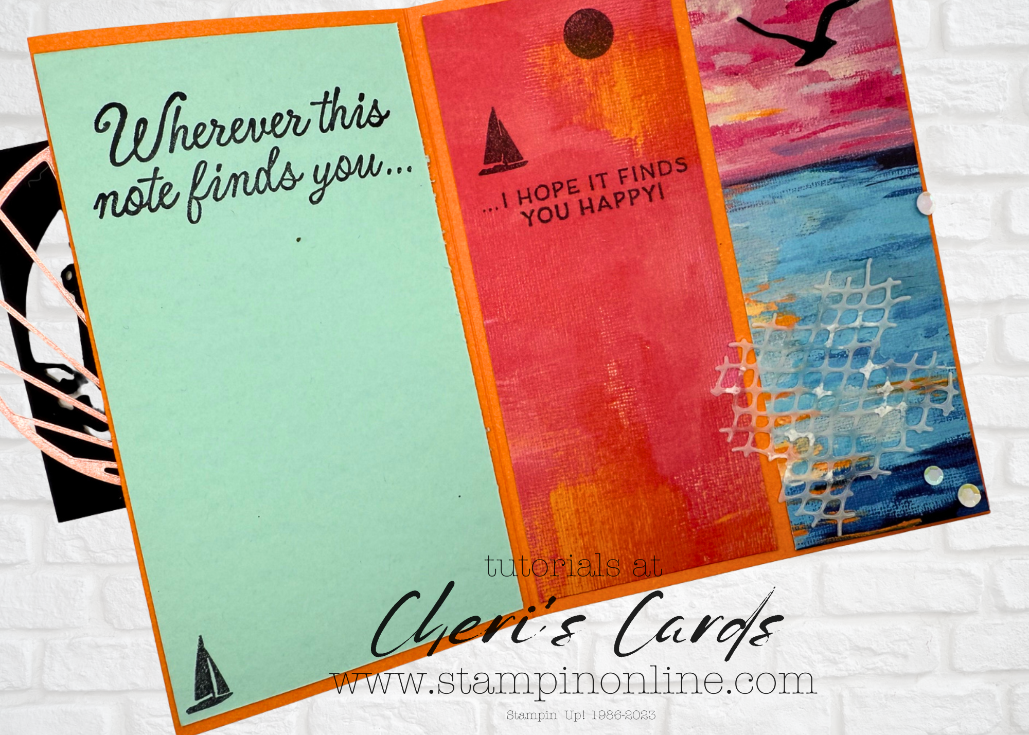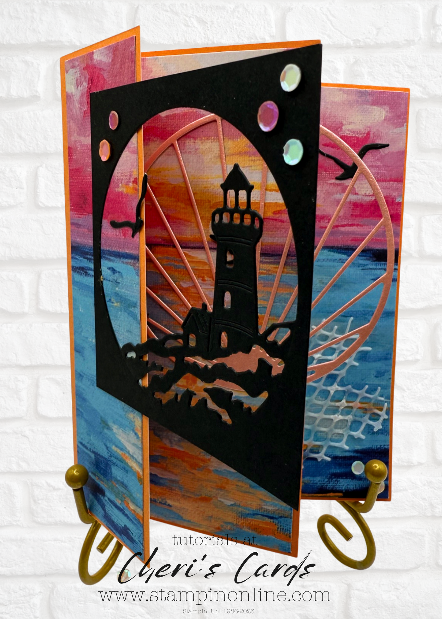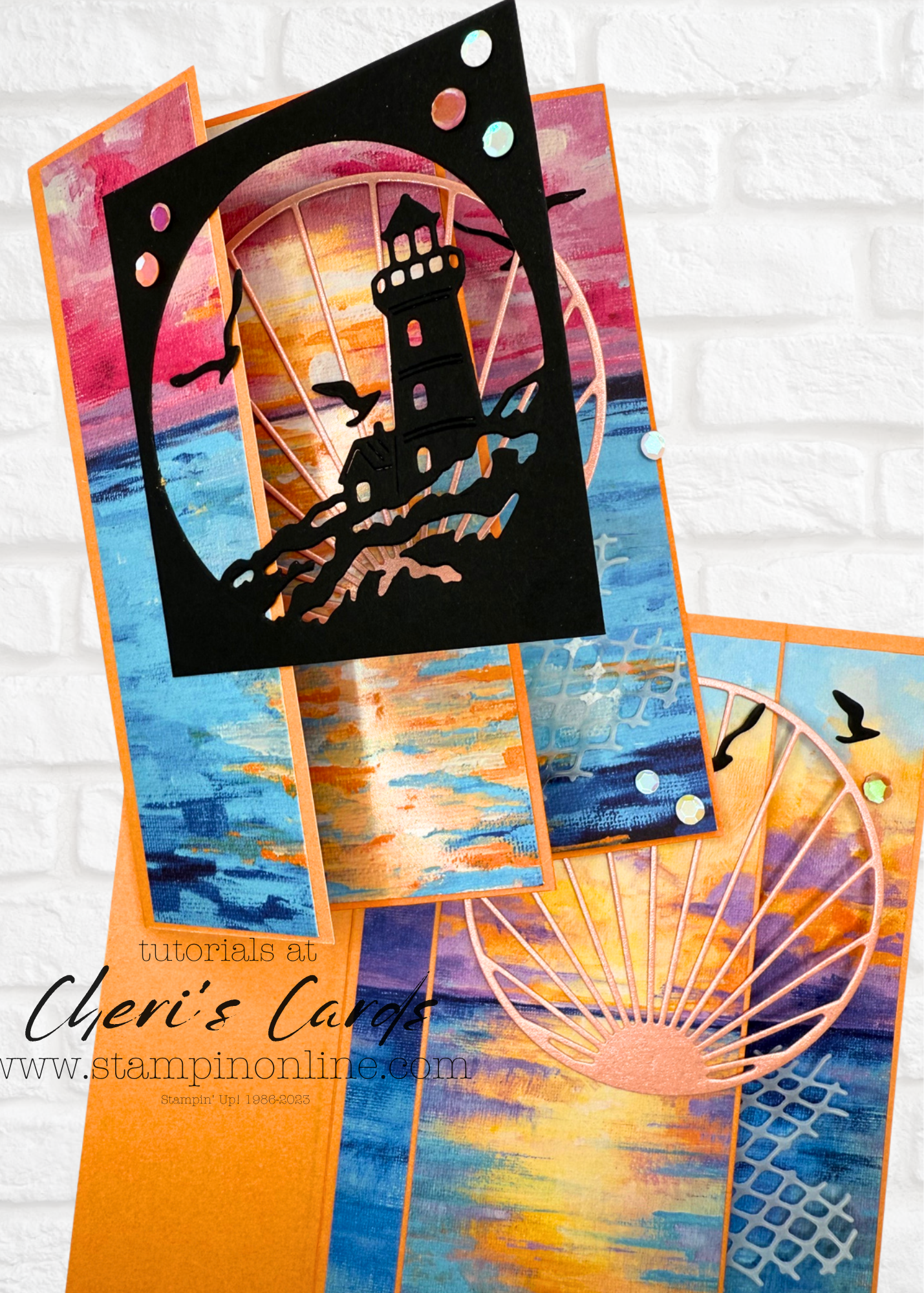 This fun fold card uses the Scenic Coast suite. So many unique accents to it. I love the sunlight shimmer on all the paper. Even though I used a past template you will see it required a bit of customizing so this paper could (literally) shine!