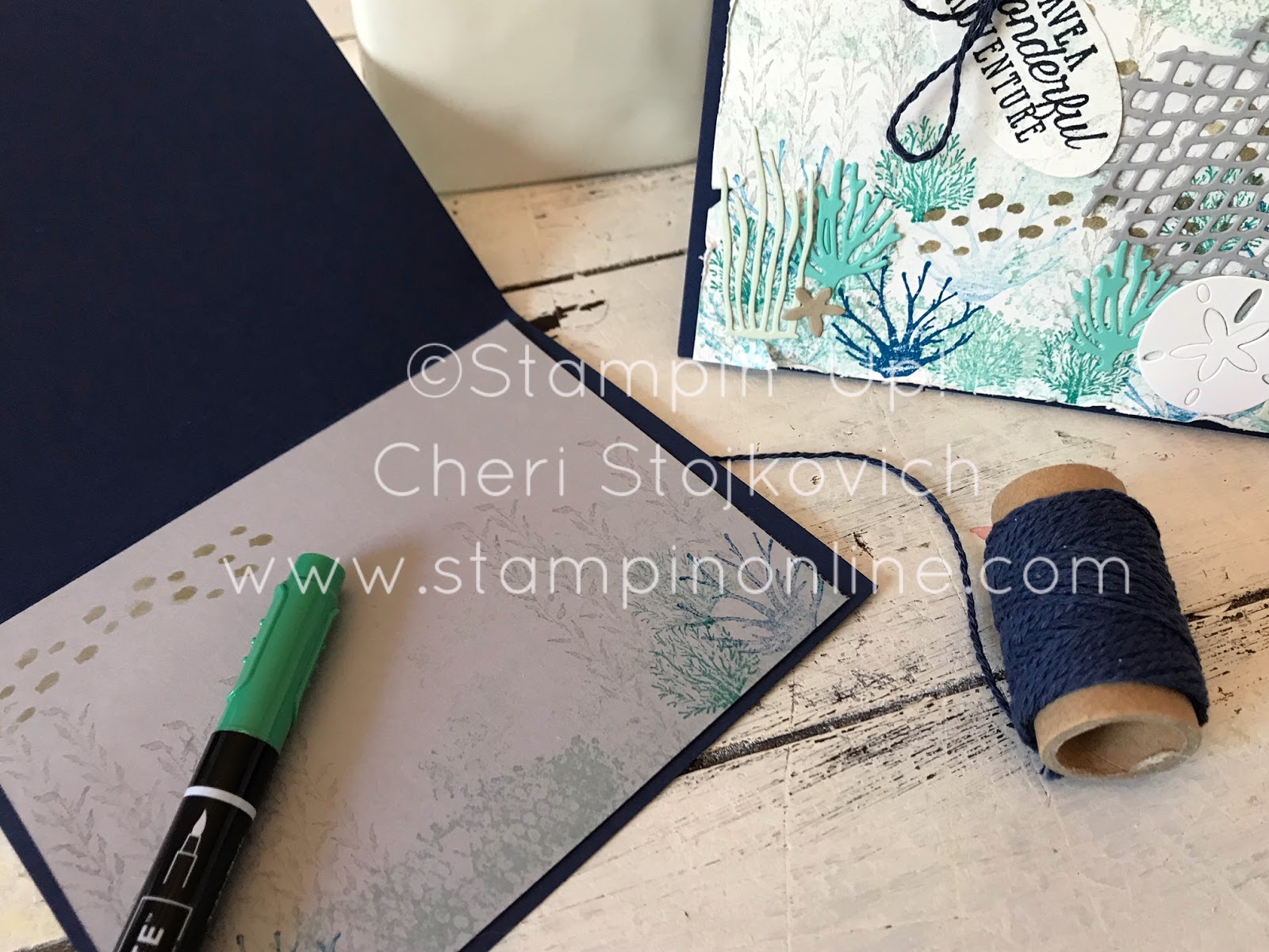 The front is shimmery – it is stamped on Shimmery White cardstock, it is perfect for the overall illusion of the ocean feel.