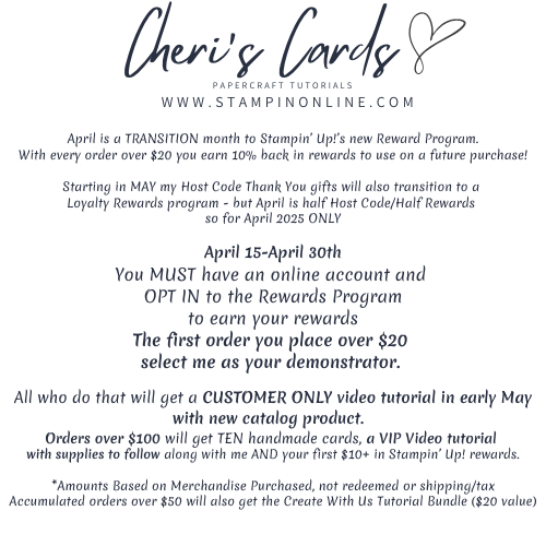Remember the NEW REWARDS program has now begun. Earn 10% BACK on every purchase you make (over $20) towards future purchases. You can check out the FAQ’s on my www.cheri.stampinup.net page and then Opt In to the program to start earning your rewards.