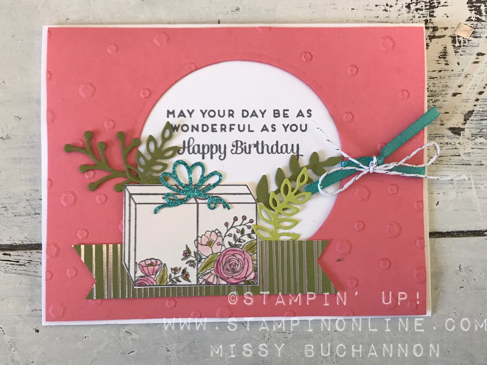 Missy did such a nice job on this elegant card. The shimmer and shine doesn’t really show up in the photos. A little bit of glitter paper, some shine in ribbon and the metallic in the paper. It is so very pretty!