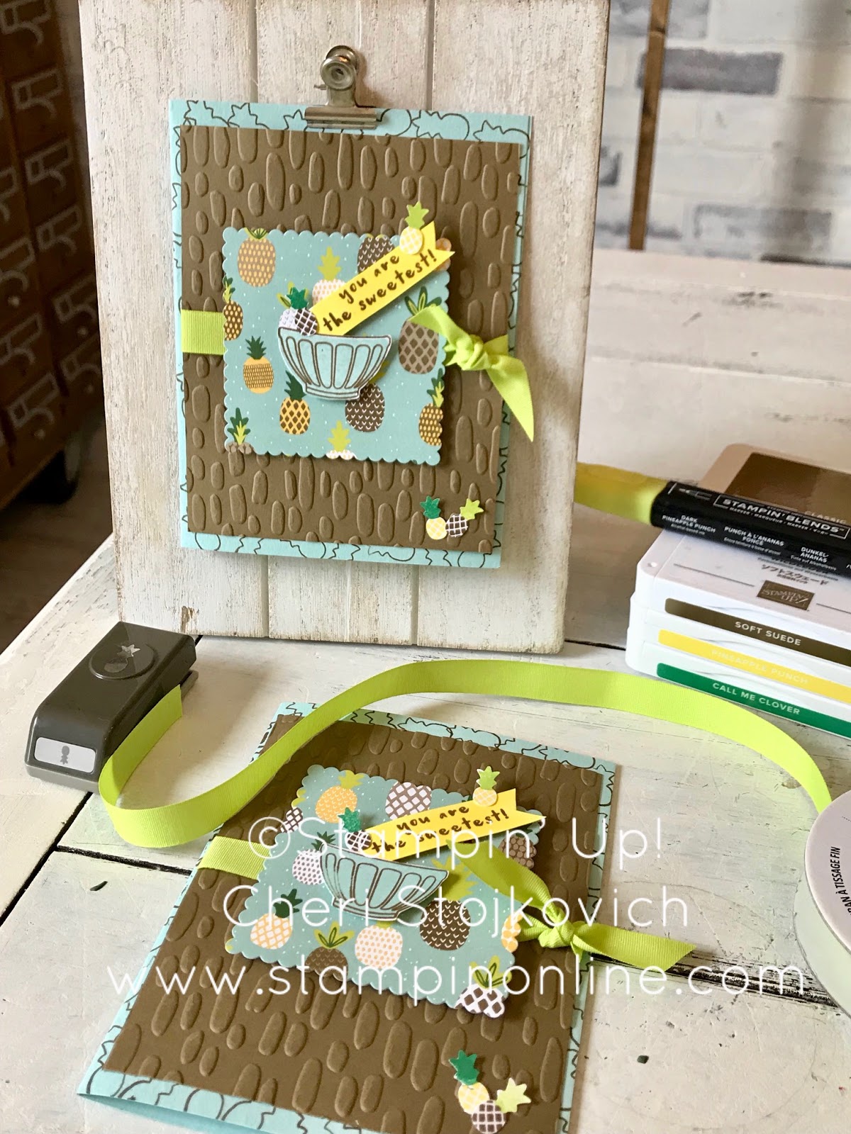 This week at camp we will be making a fun Pineapple card! See if you can spot ALL the Pineapple Punch in the picture above……..