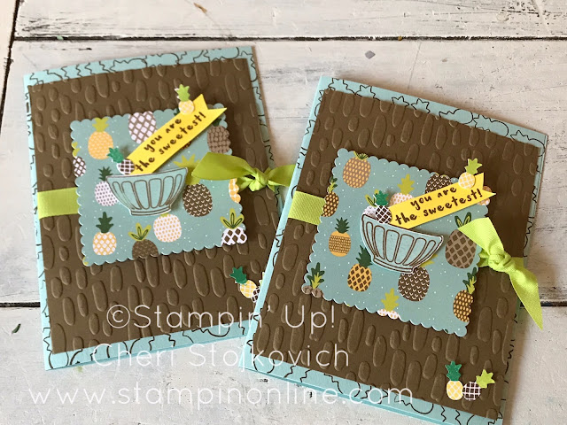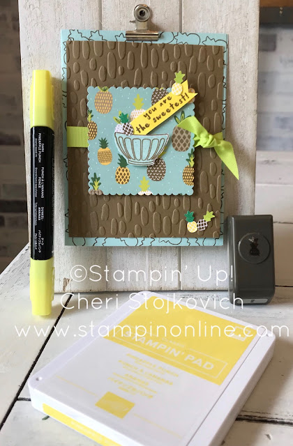 We will be using a little of everything. The Pineapple PUNCH is part of the Tutti Frutti suite that is in the Occasions mini. The paper is an adorable 6×6 stack and matches all of the other fruits that come in the suite. IT IS RETIRING! Don’t wait and be disappointed when you won’t be able to get it. I have the shopping list for this card at the bottom of the post.