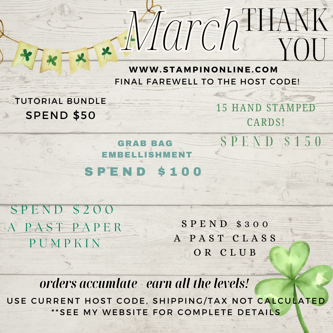 Shop using my March Host Code to qualify for my Free thank you gifts! Order totals (on merchandise only, class or club orders do not qualify) accumulate during the month, so shop more than once and I add the totals together. If any one shopping experience is over $150, no need to use the code, use the Host Rewards from SU and still qualify for my gifts to you! Orders under must use the Host Code and you must not click “no contact” on your order. I will ship rewards by the 10th of the following month. The $50 level is a Tutorial Bundle made with 13 other demonstrators from around the world.