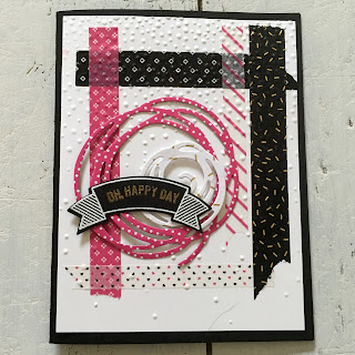 These samples feature some of the new In Colors, new background papers, new washi tape, copper embossing powder and what is sure to be one of this years best sellers – Swirly Bird. I used it to cut the fun circles on the bottom card!