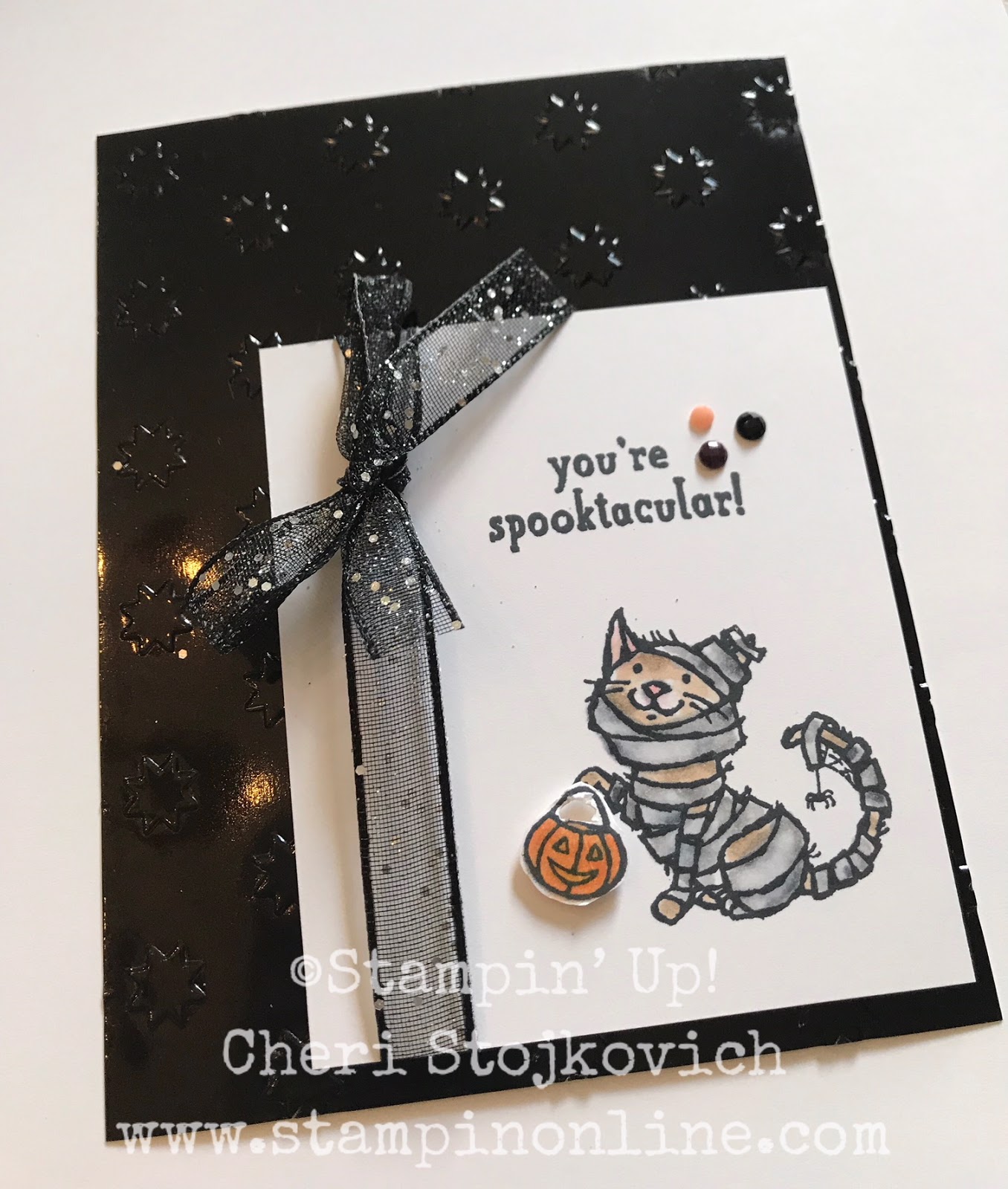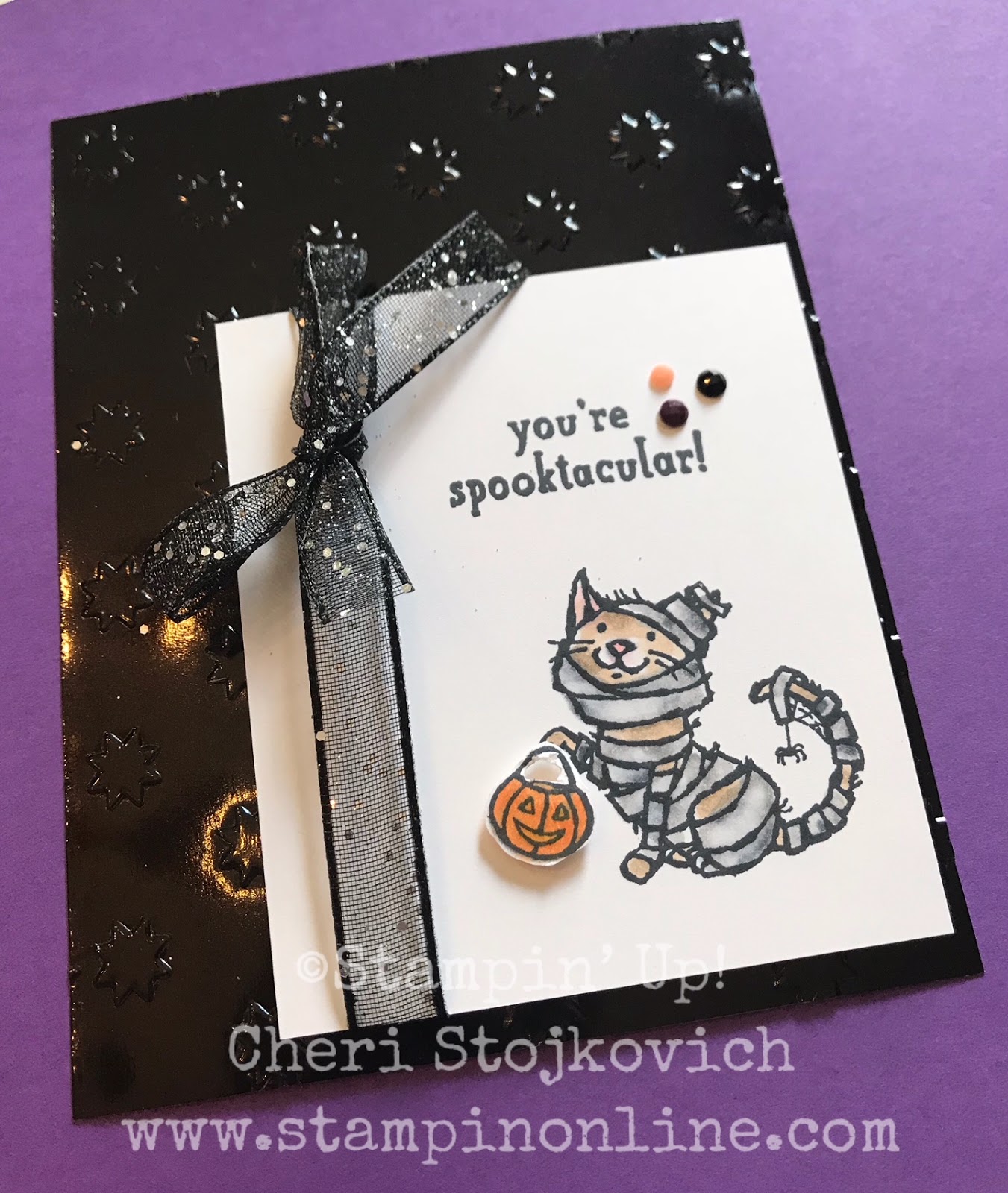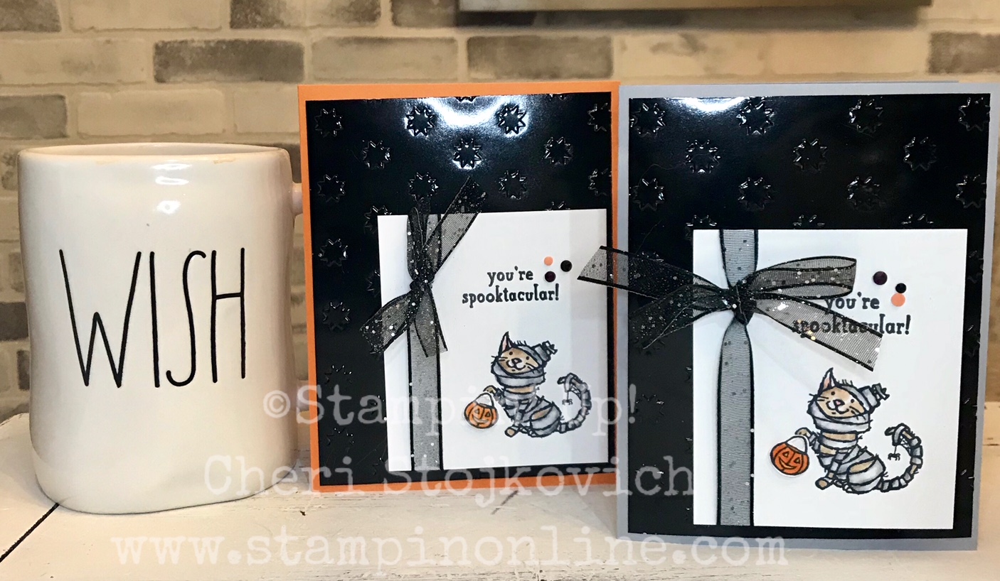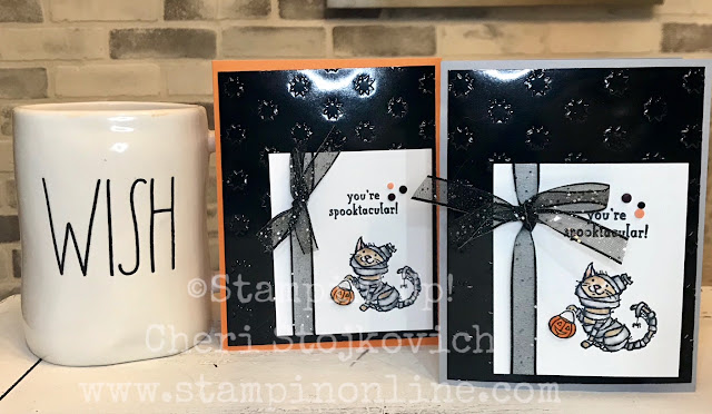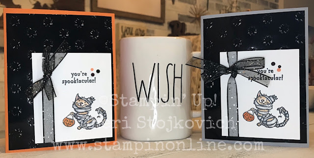 You can see when it is mounted on the Pumpkin Pie it is the little trick or treat pumpkin that your eye is drawn to. Try experimenting when you mount your cards and see the difference the back makes.