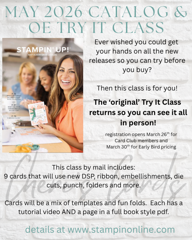 This class will feature 9 cards that all have new papers, ribbons, embellishments, die cuts, punches, folders and more. You literally get to ‘try it’ as you create the cards from a video tutorial. You will always have access to these videos, but you also get a full color PDF to download that is clickable back to the videos. The projects are template and fun fold cards. My goal is that once you try it, you know what you love the most. Then years later you can continue to return to your PDFs to recreate with new products.