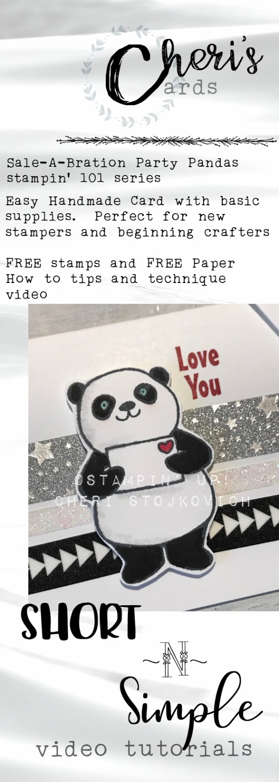 Here is your recipe list to make this adorable little card! Told you it is not much – perfect as part of my Stampin’ 101 series – and for most of you who have …a lot….of supplies…..just add some of the washi, new narrow cards and hopefully you have the Blends (if not, Sale-A-Bration is the PERFECT time to start collecting them – you can get your Pandas free then!!)