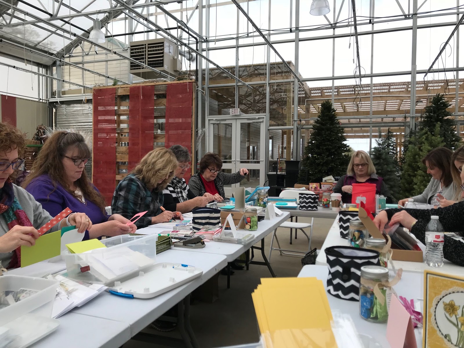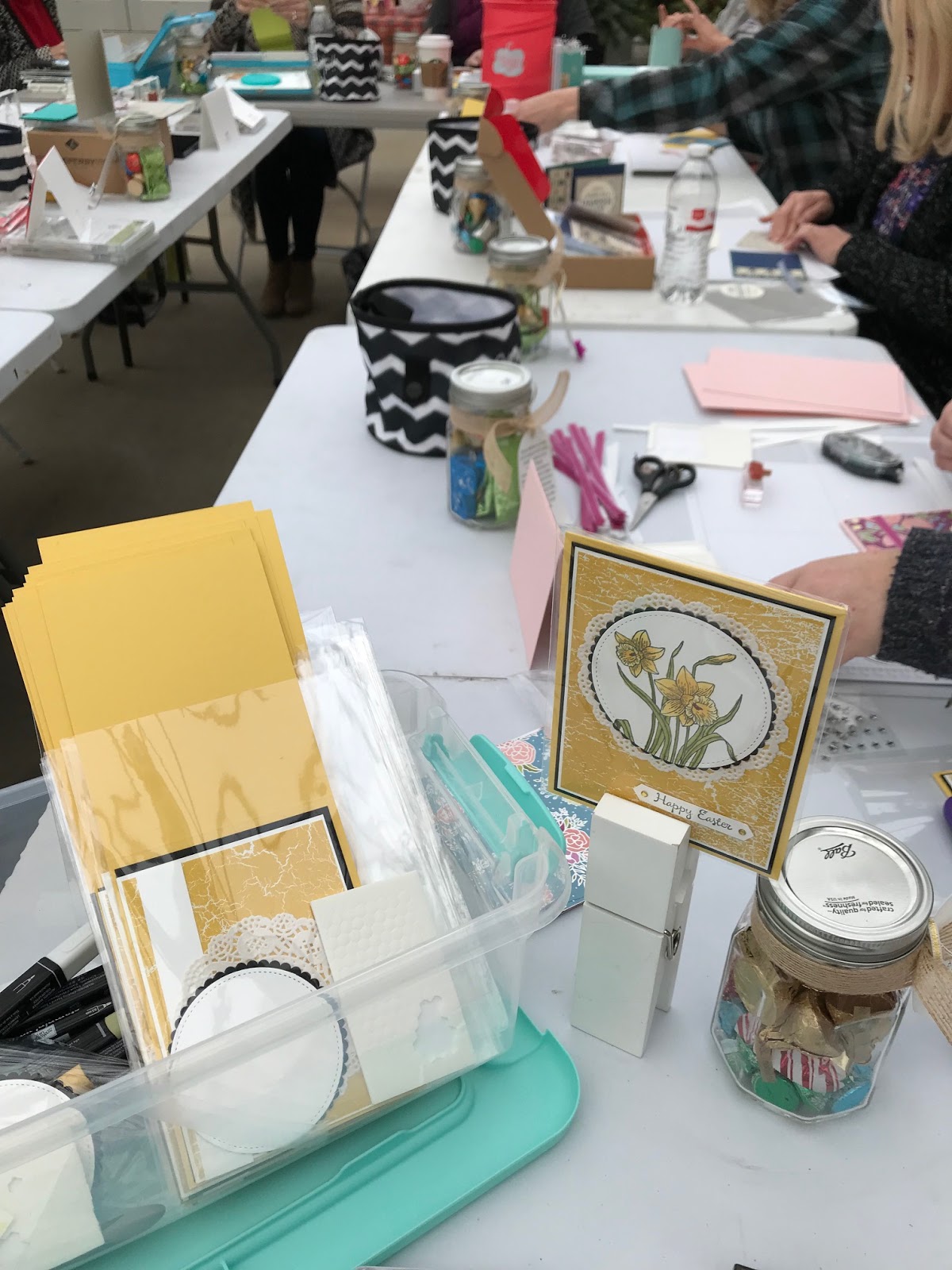 You pack up all your stuff, cut (sometimes even stamped, punched, die cut – all up to the creator) in a ‘shoebox’. When you get there, you lay your project out and everyone goes from project to project. We completed 13 projects in 3 hours!