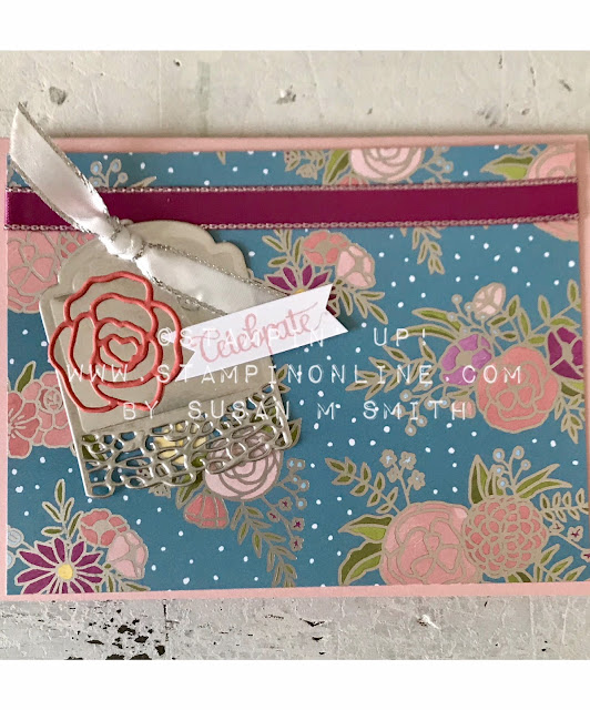This card is beautiful and looks like you slaved away, but such little effort was really involved. Susan used the Sweet Soiree suite – it is so beautiful – the metallic accents in the papers and the fine details on the dies – it is so delicate, but so simple to make! Lovely!