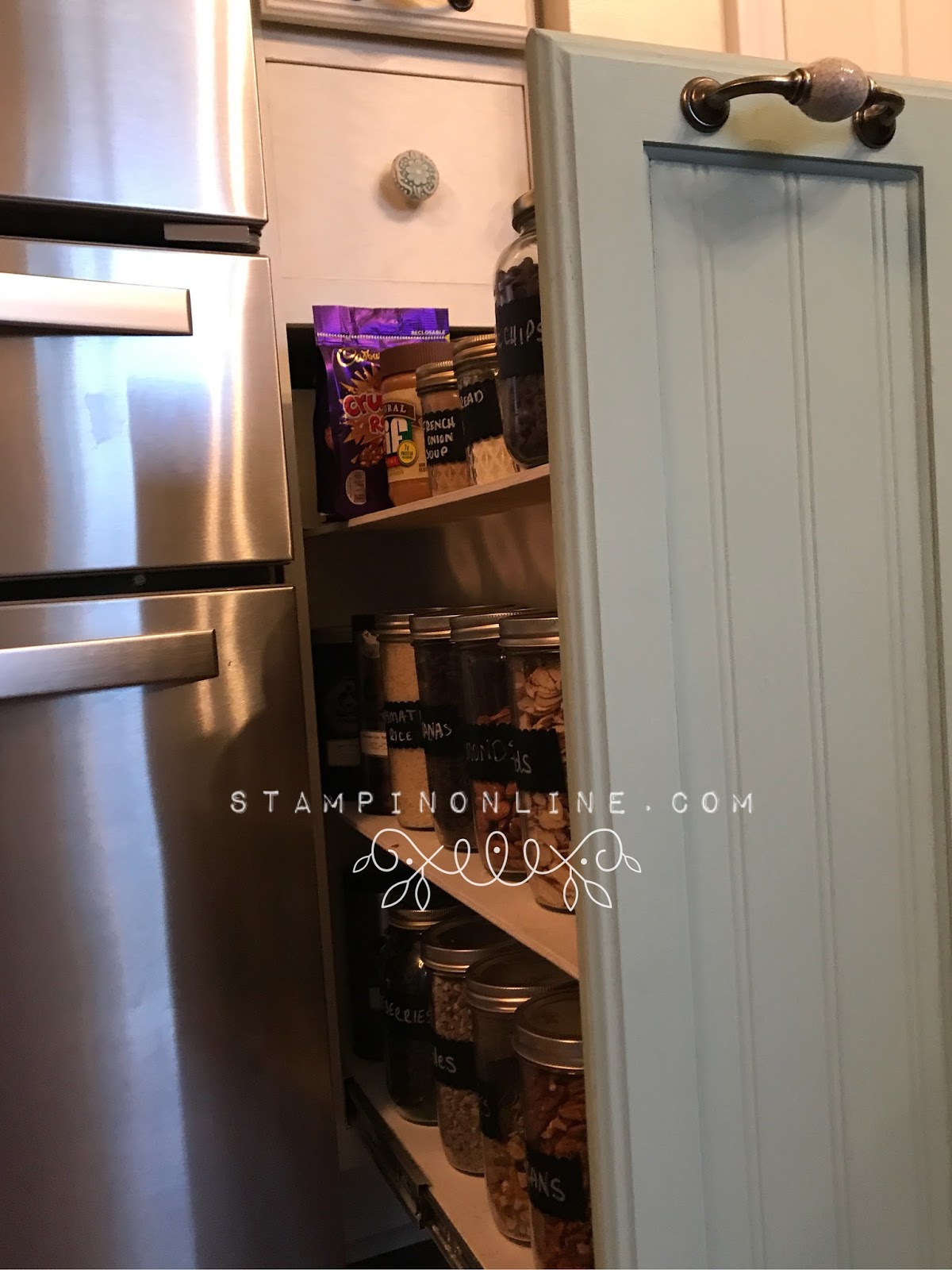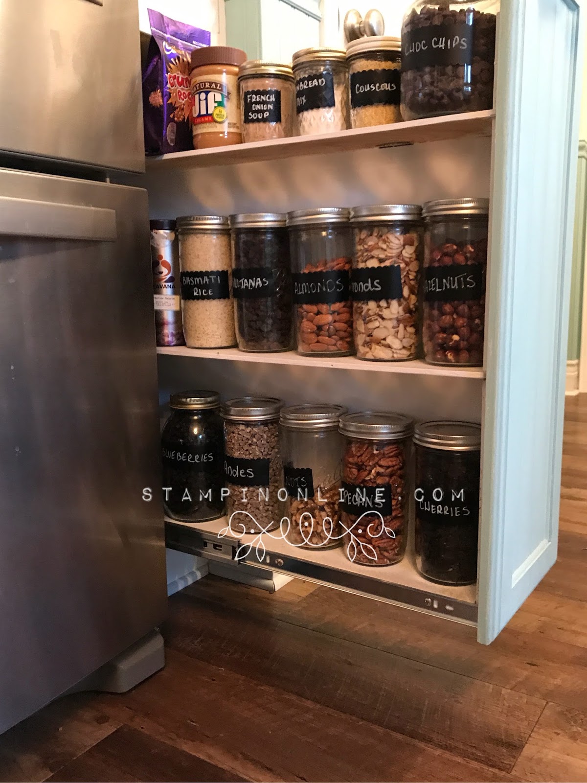 I have a Stampin’ Chalk marker that I keep in the drawer and another over in my pull out cabinets. I have some large rolls of chalk washi tape. It’s easy to just pull some off, tear it and then write what it is. It’s cute, too, and a little cute in the kitchen is always a fun thing!
