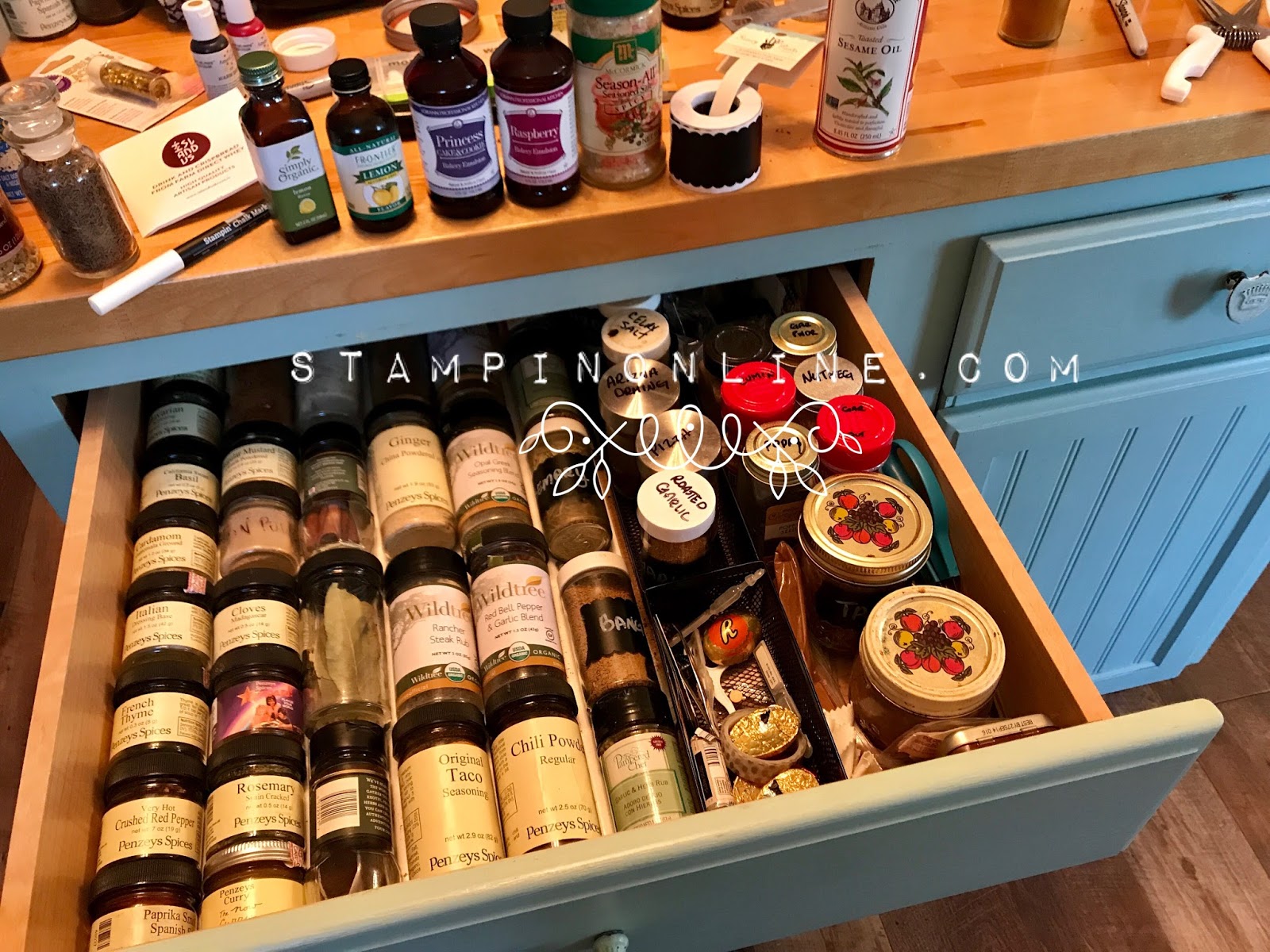 When we renovated the kitchen a few years ago we ripped out part of the cabinets. This section my husband then built into an island on wheels. We can roll it out of the way when needed. About half of my spices are kept here. All of my extracts and essences/salts/ baking powders are over by the stove. I collect more than craft supplies, lol.